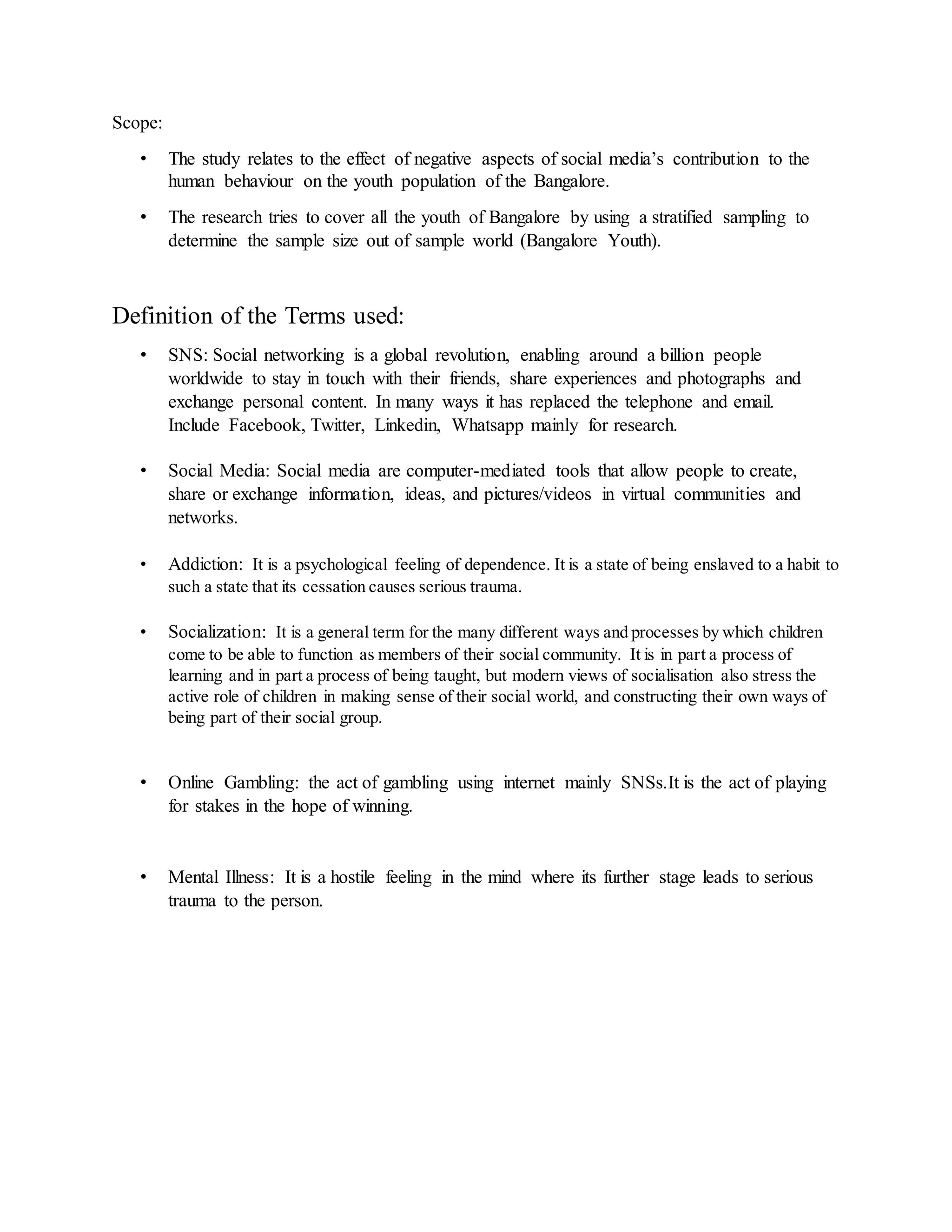This document explores the relationship between excessive use of social networking sites (SNSs) and the development of addictive behaviors and mental health issues among youth, particularly focusing on Bangalore. Findings suggest that excessive SNS usage is linked to various negative outcomes, including anxiety, decreased academic performance, and social awkwardness, with personality traits such as low conscientiousness and high narcissism correlating to higher usage. The research concludes that while social media aims to foster connectivity, its overuse poses significant risks to mental well-being and productivity.