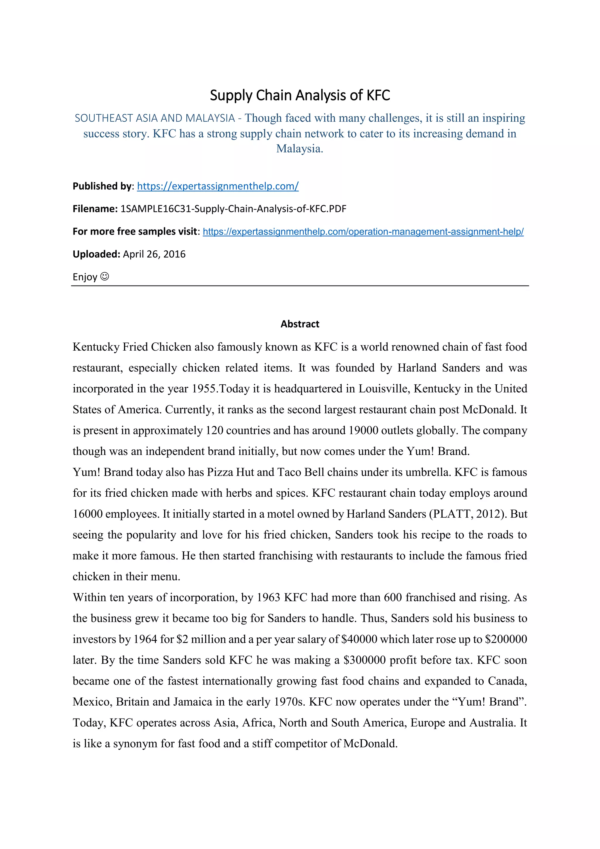 KFC, founded by Harland Sanders in 1955, has grown to become the second largest fast-food chain globally. Despite facing challenges, its strong supply chain network in Malaysia supports its success, with around 19,000 outlets across 120 countries. Now operating under the Yum! Brands umbrella, KFC continues to be a significant competitor in the fast-food industry.