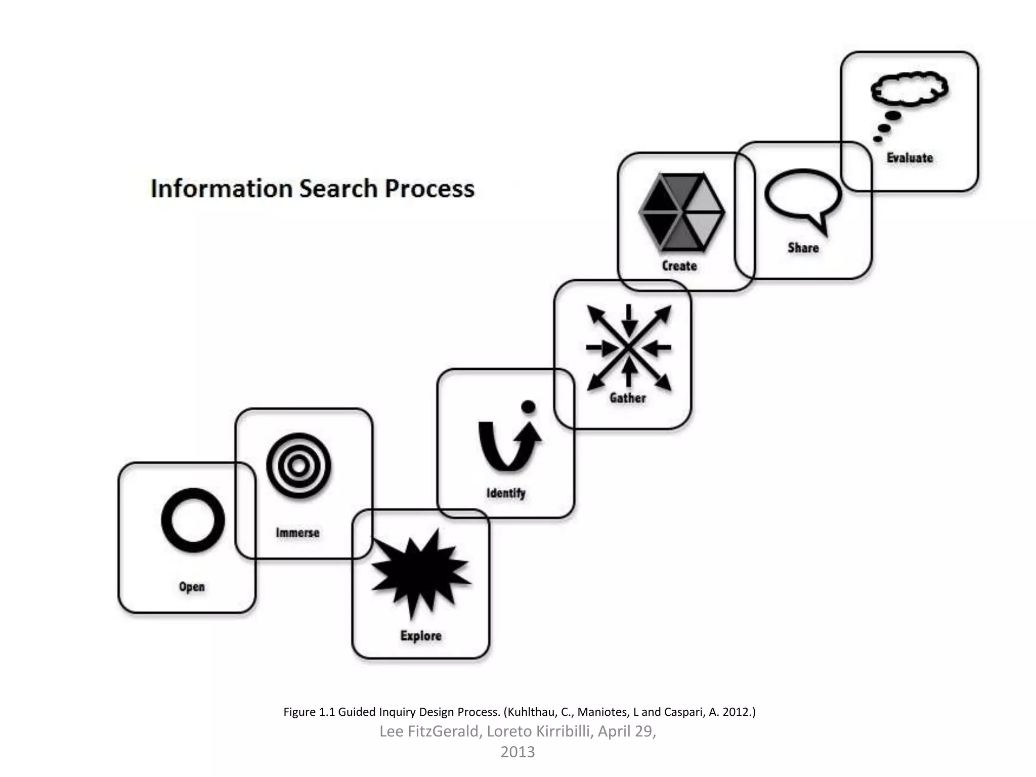 The document describes the research process as akin to a river's journey from its source to the sea. It outlines the various stages of research - Open, Immerse, Explore, Identify, Gather, Create and Share, and Evaluate - and notes that teachers and librarians provide guidance and support at each stage to help students navigate the "research river."