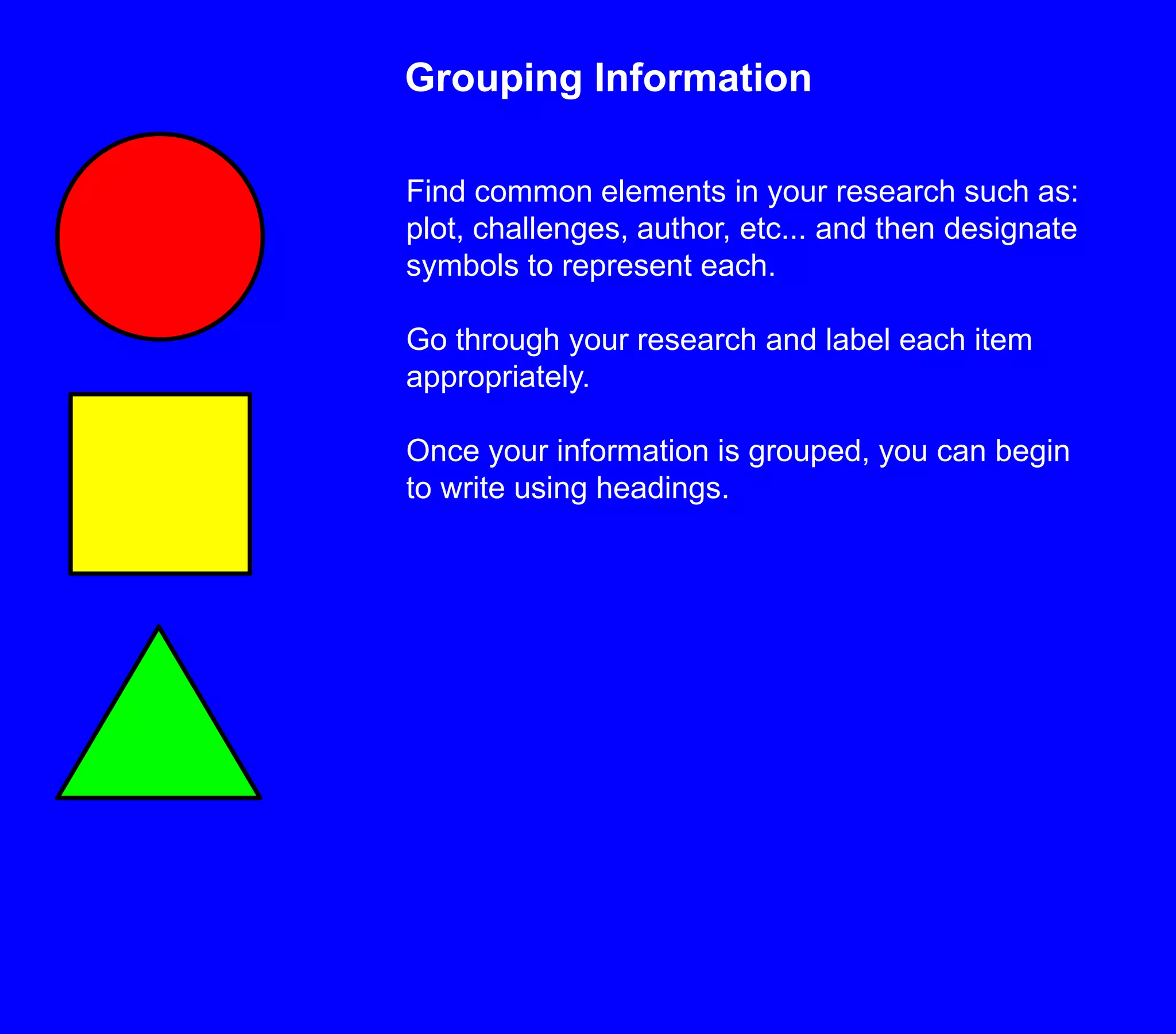 This document provides guidance on organizing research information and presenting it effectively. It recommends grouping research points into common elements or themes and labeling them with symbols. It then discusses including an engaging hook, overview of the topic and point of view, and elaboration with visual aids in a presentation. The ending should resonate and connect with the audience, not just indicate the presenter is finished. Overall, the document offers tips for taking research and developing it into a cohesive presentation that engages the audience.