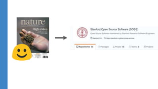 Stanford researchers are exploring various environmental and health-related topics, including the consumption of toxic plastics by mealworms and the impact of wildfires on water quality. The document emphasizes the critical role of research software in academia, noting that over 90% of researchers rely on it, while also highlighting the need for better documentation and sustainability in software practices. Additionally, there is a vision for a more connected community of research software engineers at Stanford to enhance reproducibility and maintenance in research projects.