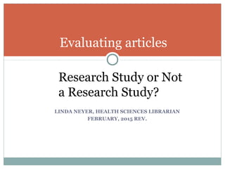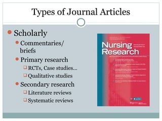 This document provides information to help evaluate whether a journal article describes a research study. It outlines different types of journal articles, including scholarly articles describing primary research like randomized controlled trials and case studies, as well as professional articles like editorials and literature reviews.