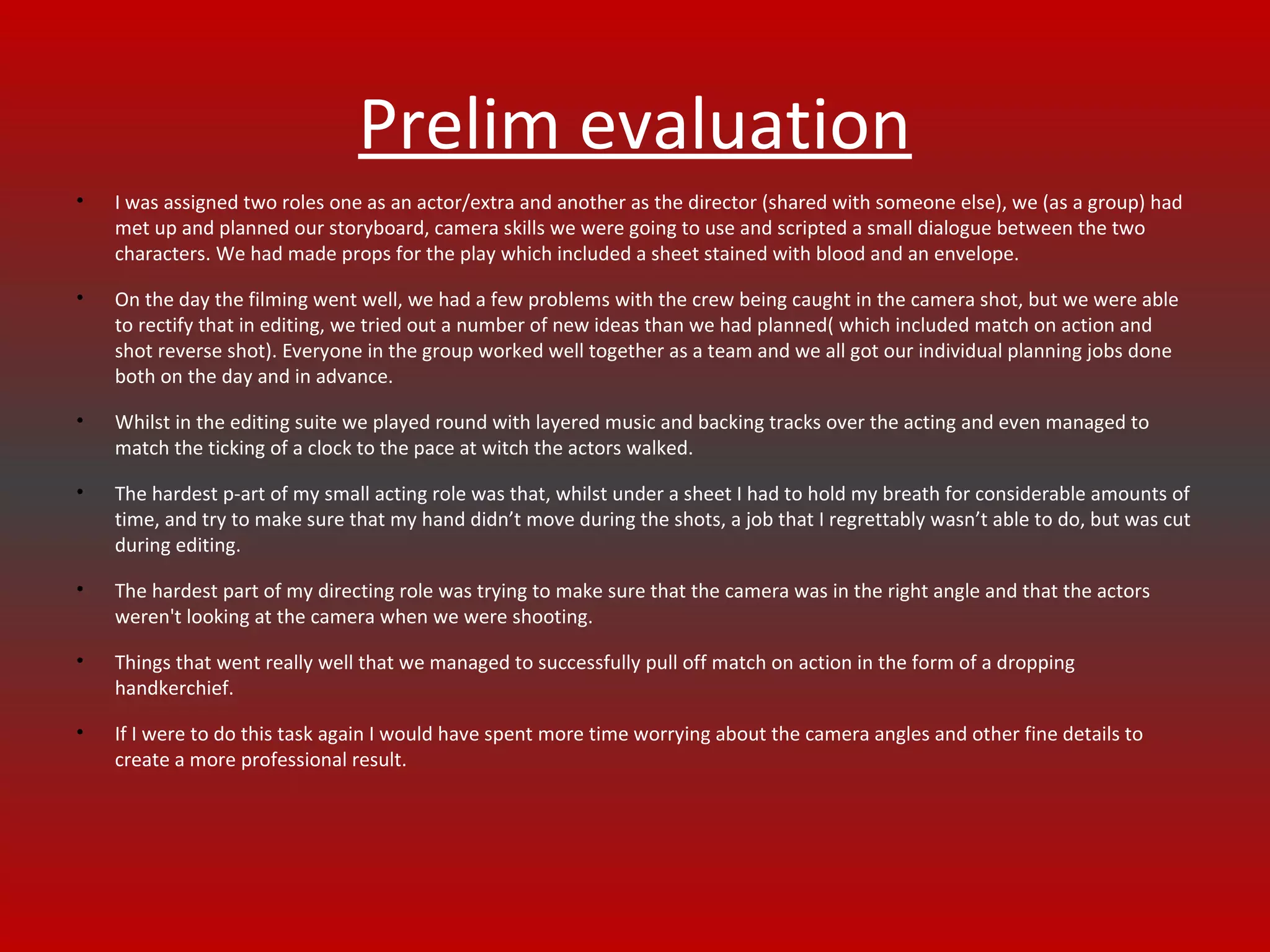The document summarizes a student film project. It describes how the student was assigned acting and directing roles. They storyboarded and planned shots, props, and dialogue with their group. On the day of filming, there were some issues with crew in shots but they were fixed in editing. New ideas like match cuts and shot reverse shots were tried. Editing involved adding layered music and syncing a clock tick to actor movement. The hardest parts were holding breath under a sheet and ensuring proper camera angles during shoots. Match cuts with a dropping handkerchief were successfully executed. For future projects, the student would spend more time on camera angles and details to make a more professional result.