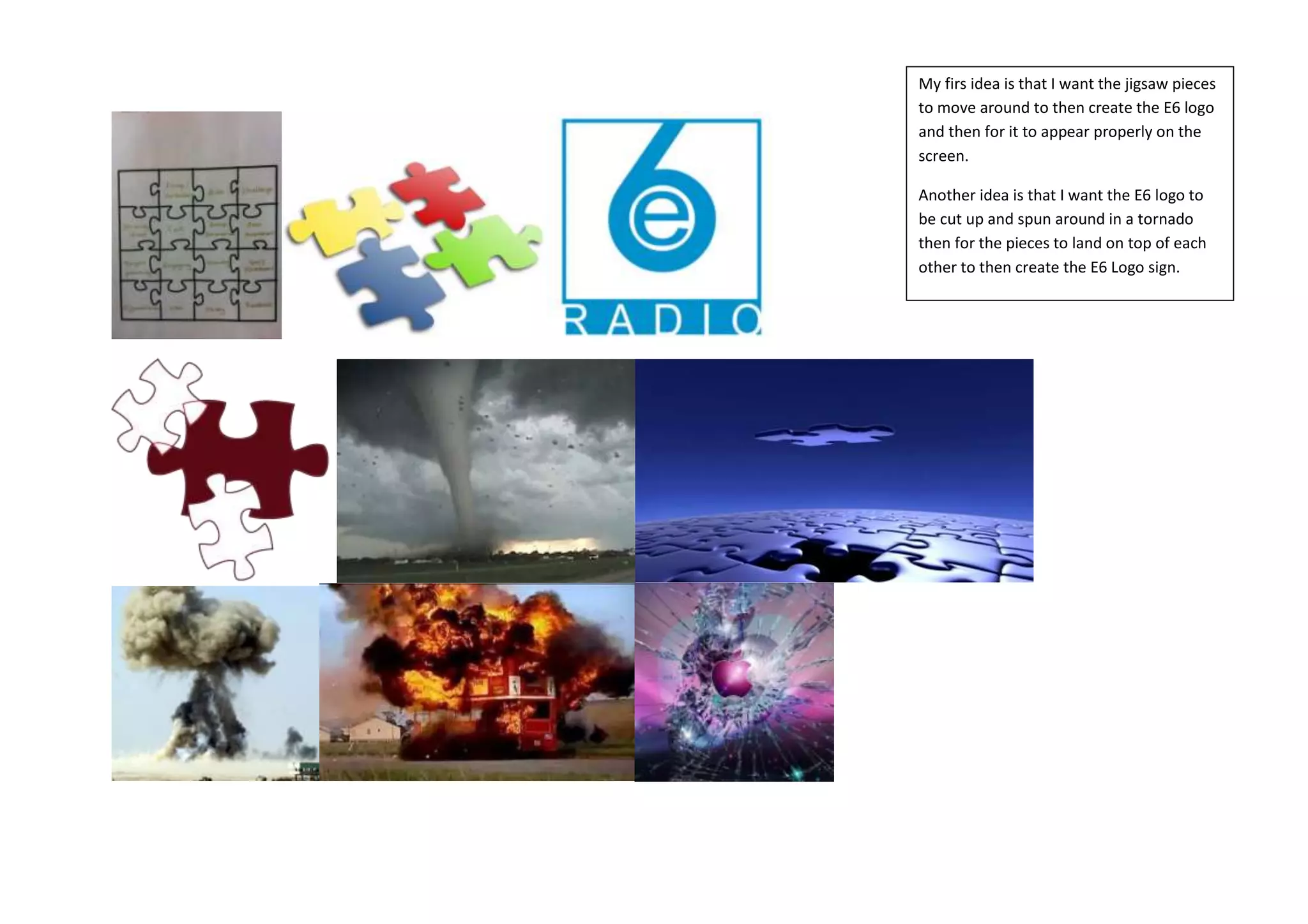The first idea is for jigsaw puzzle pieces to move around and form the E6 logo on the screen. Another idea is for the E6 logo to be cut up and spun around in a tornado, then have the pieces land on top of each other to recreate the E6 logo.