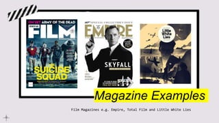 The document analyzes the covers of three film magazines - Empire, Total Film, and Little White Lies - identifying codes and conventions. For Empire, codes include using red in the masthead to reference violence in Star Wars and using black/grey costumes to identify villains. Conventions include a prominent masthead and varying text sizes. Total Film uses different blues to reference relaxation and features a central masthead. Little White Lies has a unique sans-serif font and illustration overlapping the masthead, with colors referencing the desert setting of the featured film Dune. The magazines' websites also feature codes and conventions from their print editions.