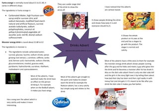 Fanta orange typically costs between £1-£1.40. Its ingredients include carbonated water, high fructose corn syrup, citric acid, artificial flavors, and food dyes. Monster energy drink costs around £1.80-£2 and contains carbonated water, sugars, taurine, caffeine, and other ingredients. Most drink ads feature cartoon-style stories showing the drink's energizing effects and making the product seem appealing. They aim to catch viewers' attention and make them want to try the drink.