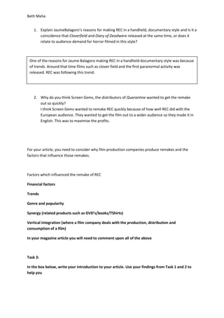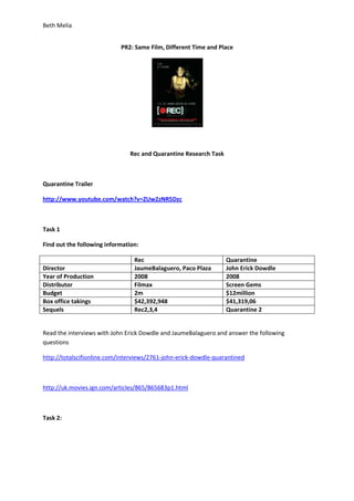 This document discusses the films REC and its American remake Quarantine. It provides background information on the directors, years of release, budgets, box office earnings, and filming styles of both films. It examines factors that influenced the quick remake of REC as Quarantine, such as financial motivations in reaching a wider English-speaking audience. The introduction to the planned magazine article discusses how film companies produce remakes to maximize profits, citing examples of REC and Quarantine having the same plot but being filmed in different languages to expand their audiences. It analyzes the production contexts relating to trends, genres, and studio business models around the two similar films.