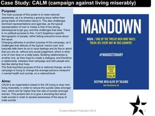 The CALM organization aims to reduce male suicide rates in the UK through awareness campaigns. Their campaigns use bold, eye-catching designs with simple fonts and visual hierarchies to draw attention to shocking suicide statistics. CALM runs billboard campaigns nationwide and partners with other organizations on initiatives like magazine articles and fashion collaborations. However, suicide rates rose in 2011 after CALM launched, though long-term campaigns may be needed to significantly impact attitudes surrounding mental health issues.