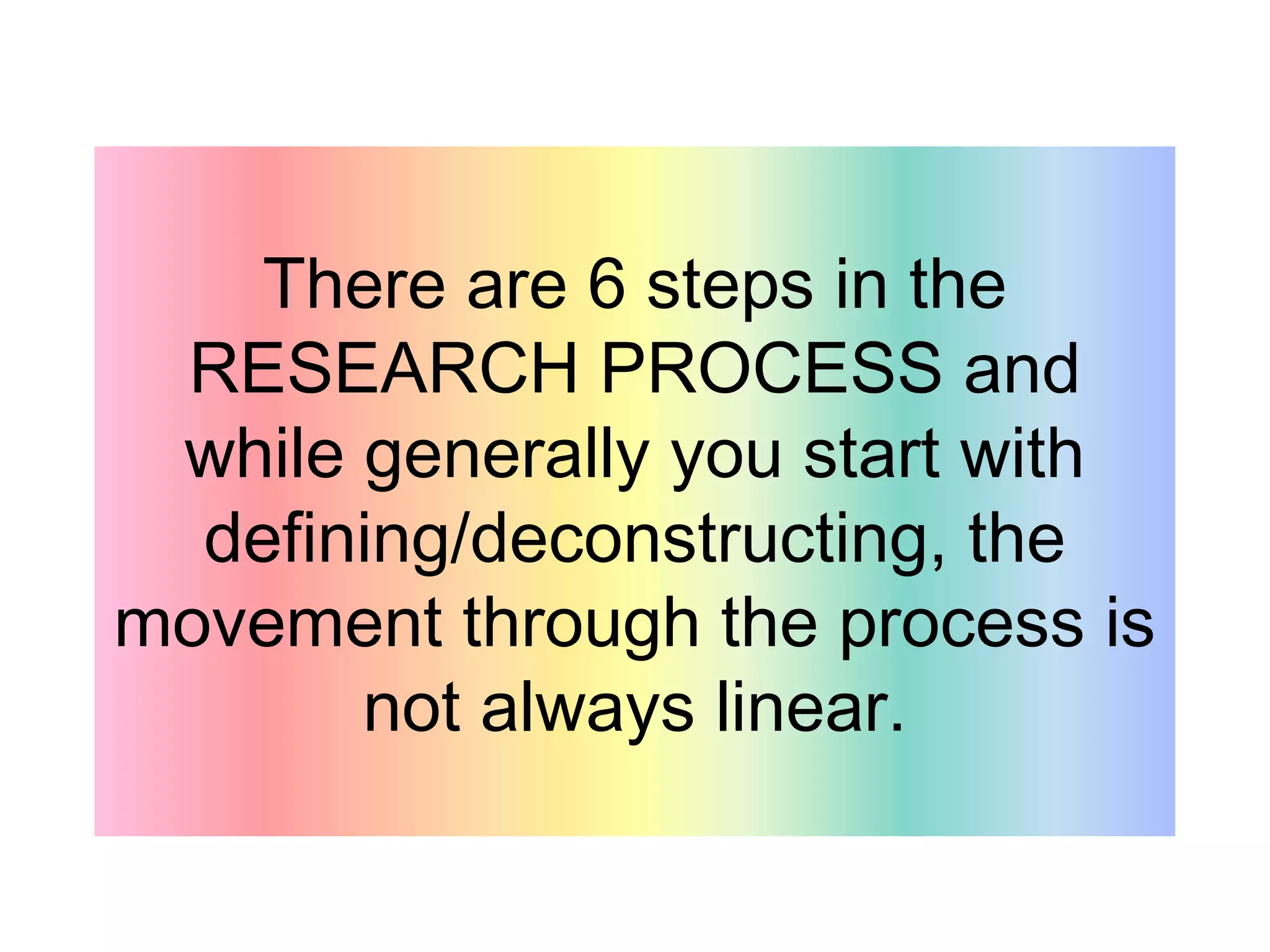 There are 6 steps in the research process: 1) define and deconstruct the topic or question, 2) locate relevant information, 3) select and analyze sources, 4) organize and synthesize the information, 5) present findings, and 6) evaluate the process and results. While the steps generally proceed in order, the process is not always linear. Each step involves specific strategies like creating concept maps, developing search terms, analyzing sources for validity, organizing notes, and reflecting on improvements.