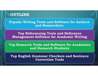 This document discusses and recommends various tools for research and writing. It begins by outlining popular writing tools for authors and researchers, including Microsoft Word, Latex, OpenOffice, LibreOffice, Scrivener, Google Docs and Dropbox Paper. Next, it discusses top referencing tools and reference management software for academic writing such as Zotero, Mendeley, EndNote, RefWorks and Citavi. Finally, it recommends top research tools for academics and students, including REF-N-WRITE, online statistical tools, Google Scholar, ResearchGate, plagiarism detection software and project management tools.