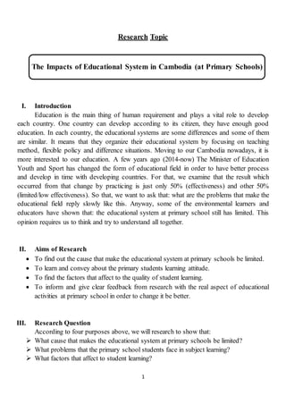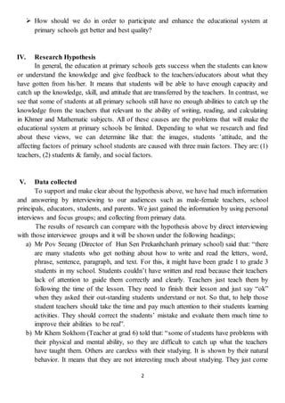 The document discusses research into the impacts of Cambodia's educational system at primary schools. It aims to identify factors limiting the system's effectiveness and quality of student learning. Through interviews, several key issues were identified. Teachers sometimes lack attention to student needs and clear lesson delivery. Students may struggle due to physical, mental or social factors like domestic responsibilities or neighborhood influences. Parents also may not prioritize supporting education. The educational system remains limited due to issues with teachers, students/families, and social environments. Improving teacher skills, student support at home, and social conditions could enhance the primary school system.