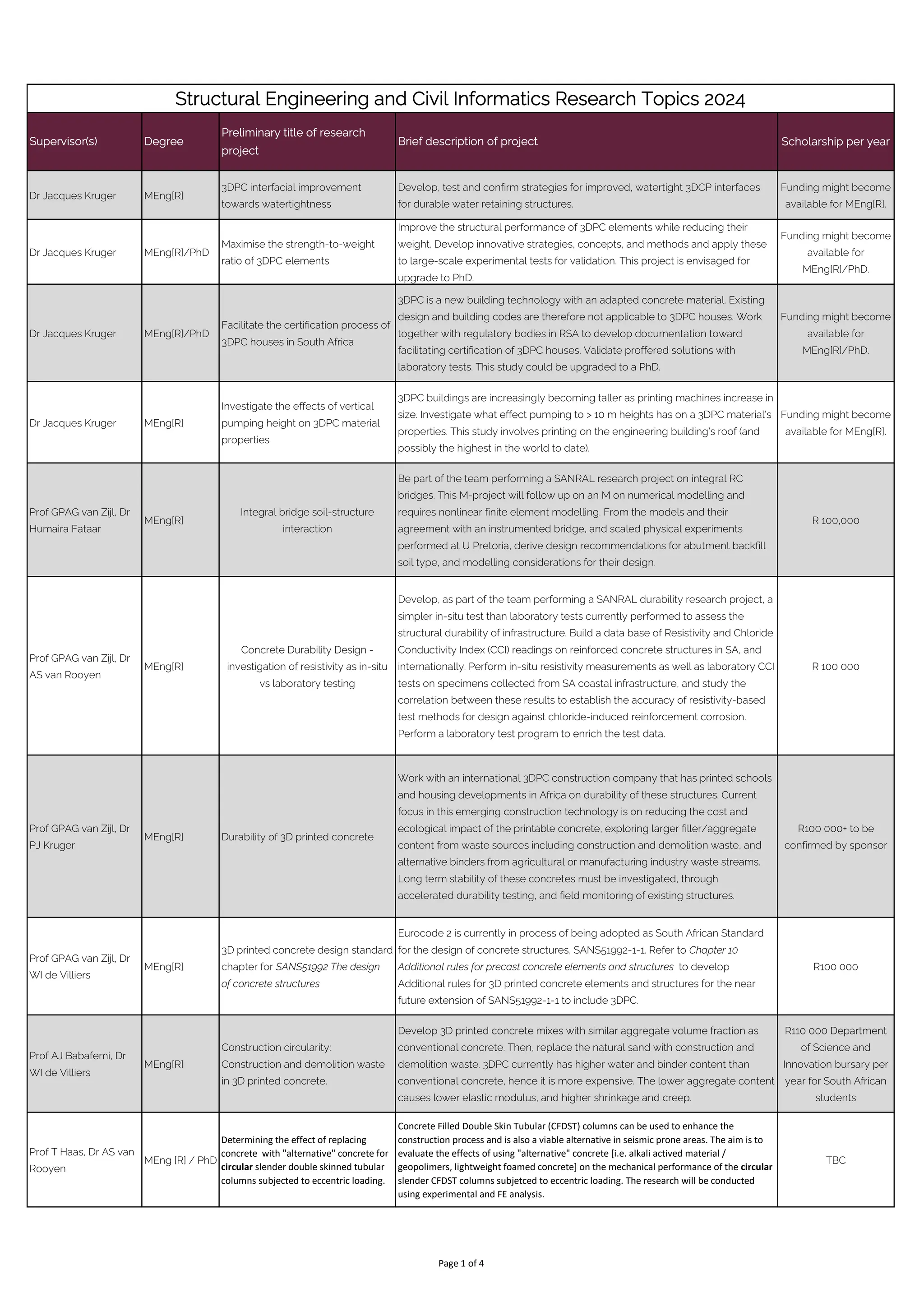 The document outlines various research projects led by Dr. Jacques Kruger and others in the field of structural engineering and concrete technology, focusing on innovations in 3D printed concrete, concrete durability, and the use of alternative materials. Key topics include improving the watertightness of 3D printed constructions, investigating the structural performance of columns under different load conditions, and the impact of eco-friendly materials in construction. Funding opportunities are mentioned throughout for master's and PhD programs to support these advanced studies.