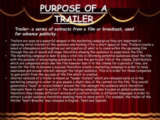 Trailers are short clips used to generate interest in upcoming films. They aim to capture audience attention and create anticipation through dramatic images and sounds over 3 acts: (1) introducing the context and characters, (2) establishing problems and climax, (3) highlighting key moments and stars. Trailers use transitions like fades and cuts, shots like close-ups, and non-diegetic sounds to set mood and imply drama. The goal is to attract large audiences and profit for film distributors.