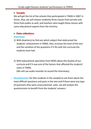 The document proposes a study to investigate the performance of eighth-grade Omani students in the TIMSS (International Mathematics and Science Study) and aims to identify factors affecting their achievement, particularly comparing private and public school students. It outlines the methodology for data collection, including interviews with teachers and educational experts, and student questionnaires to analyze challenges in test performance. The literature review references previous studies on curriculum, gender differences in achievement, and the overall efficacy of mathematics education in various countries.
