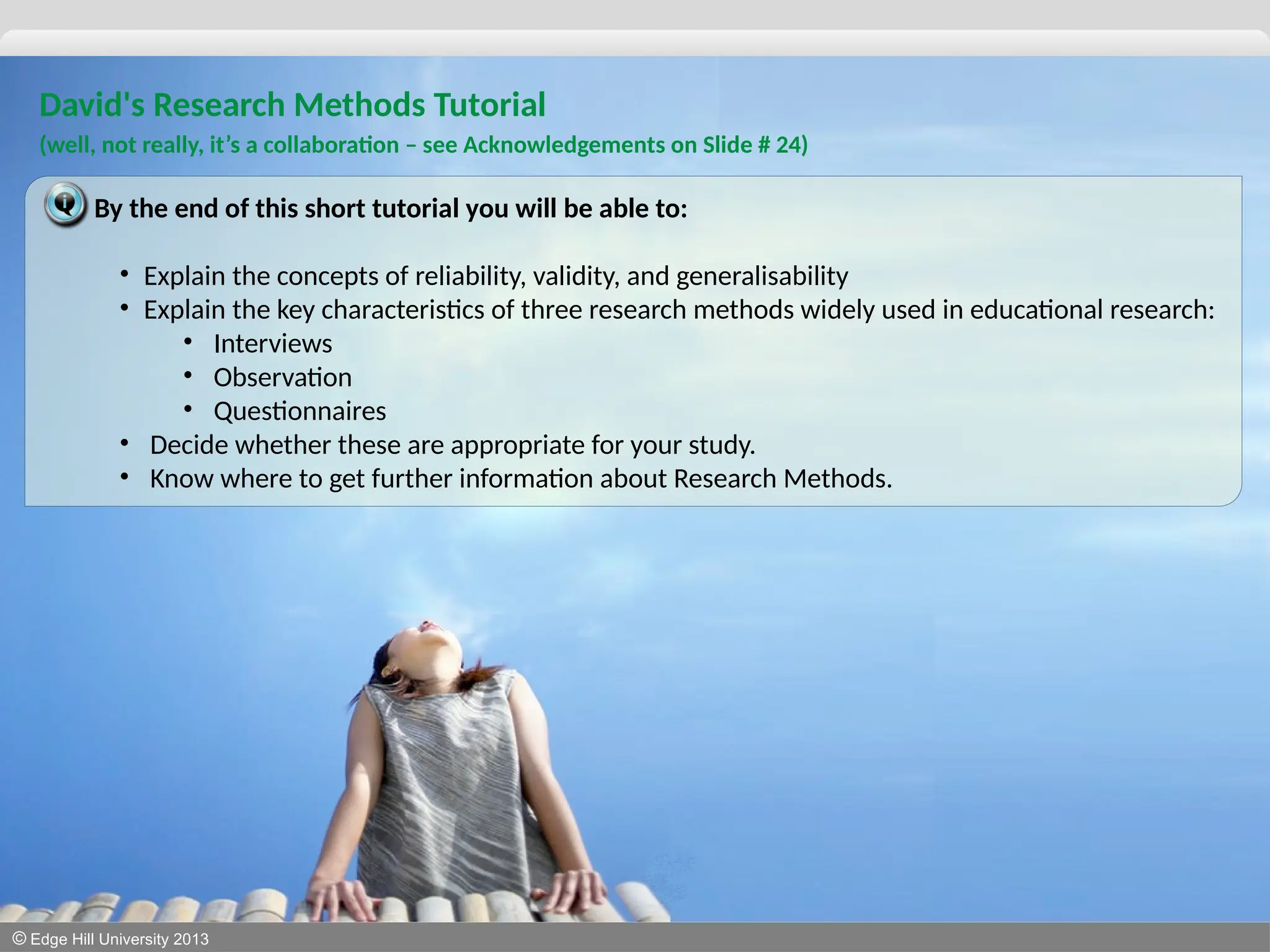 This tutorial is based on Cohen et. al.’s (2011) Research methods in Education, 7th