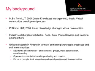 Miia Kosonen is a PhD senior researcher at Lappeenranta University of Technology who specializes in virtual communities, virtual collaboration, and social media. Her background includes an MSc from LUT in knowledge management and a PhD from LUT on knowledge sharing in virtual communities. Her research focuses on computer-mediated communication theories, community psychology, the knowledge-based view of the firm, and the social dynamics and sense of community in virtual environments. She lectures on business communication and knowledge management and supervises MSc students.