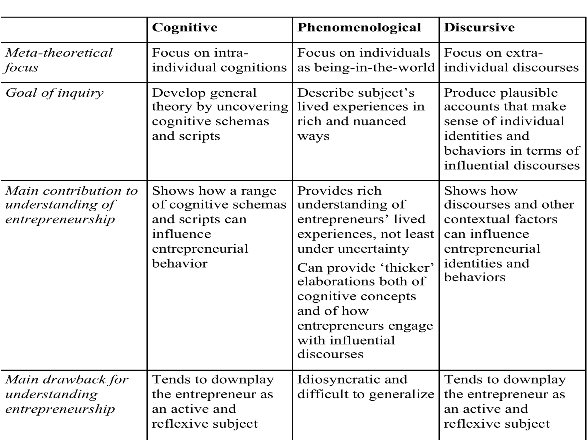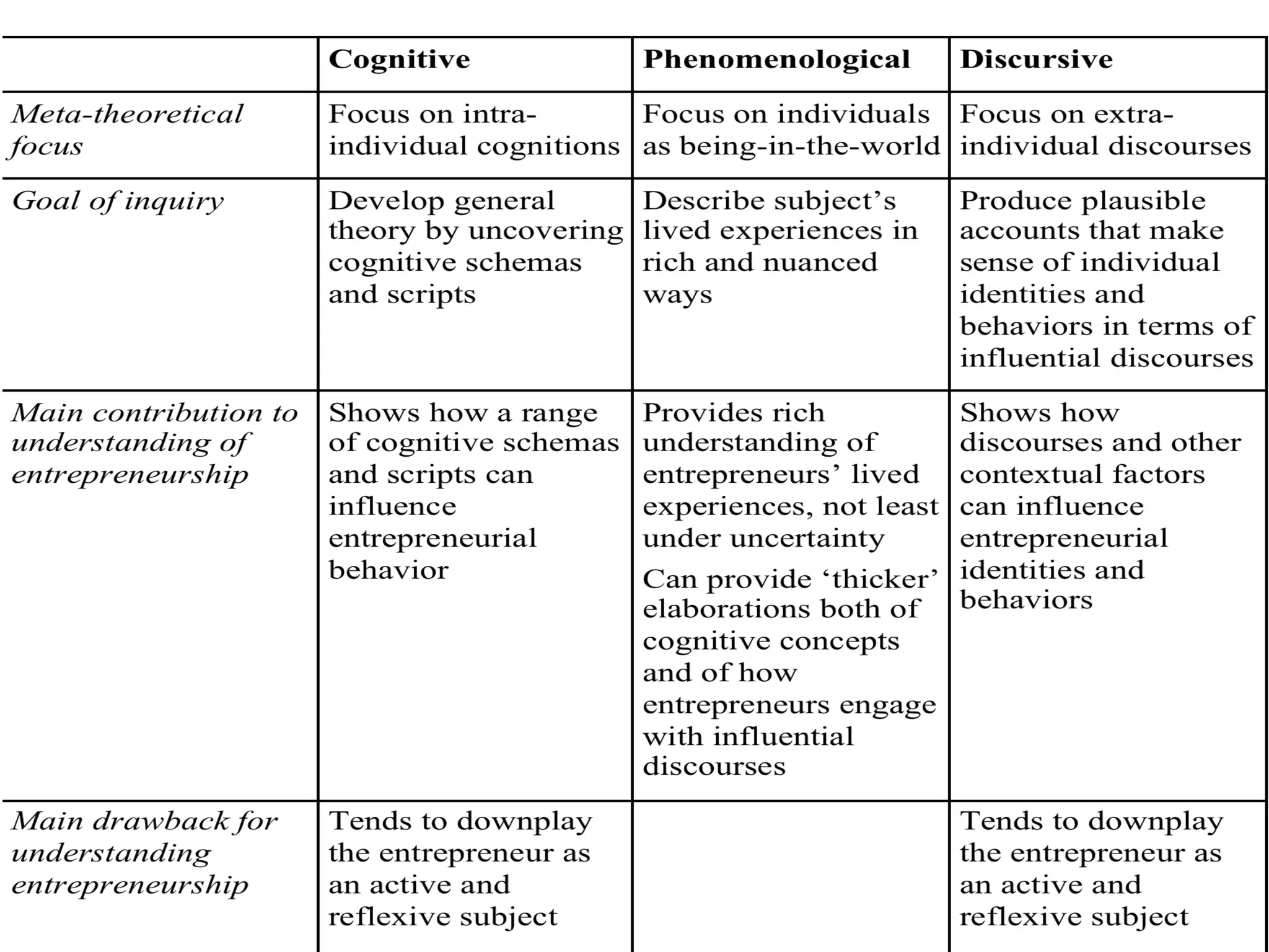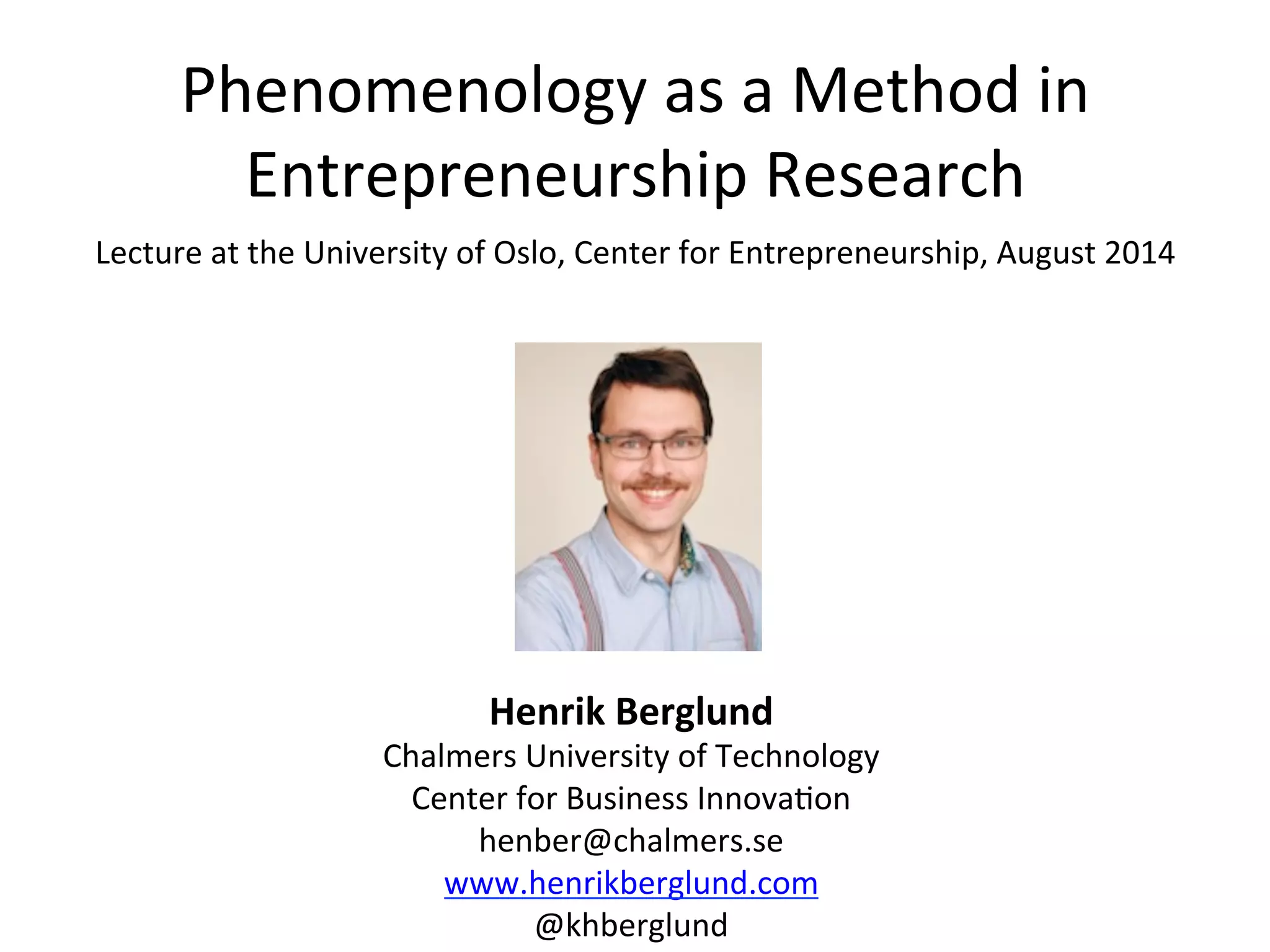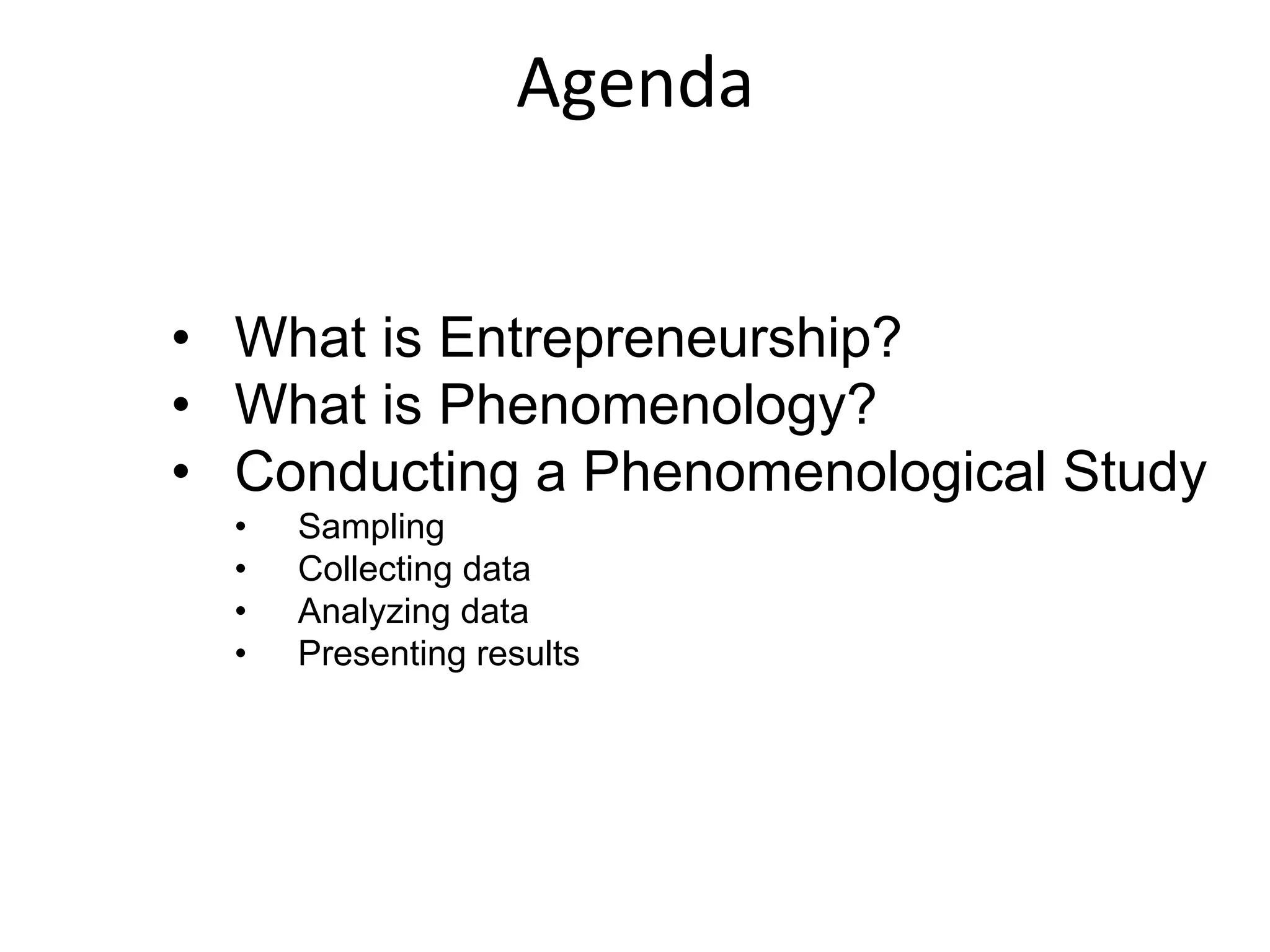 The document discusses phenomenology as a method for studying entrepreneurship. It begins by defining entrepreneurship as creating new products/services under conditions of uncertainty, rather than just small business ownership. It then discusses common approaches to studying entrepreneurs like traits, behaviors, cognitions and discursive factors, and argues phenomenology can provide insights these miss by focusing on entrepreneurs' lived experiences. The document provides an overview of phenomenology's principles and methods, including purposive sampling, semi-structured interviews to understand experiences, and analyzing data for themes. It provides examples of phenomenological entrepreneurship research questions and studies.