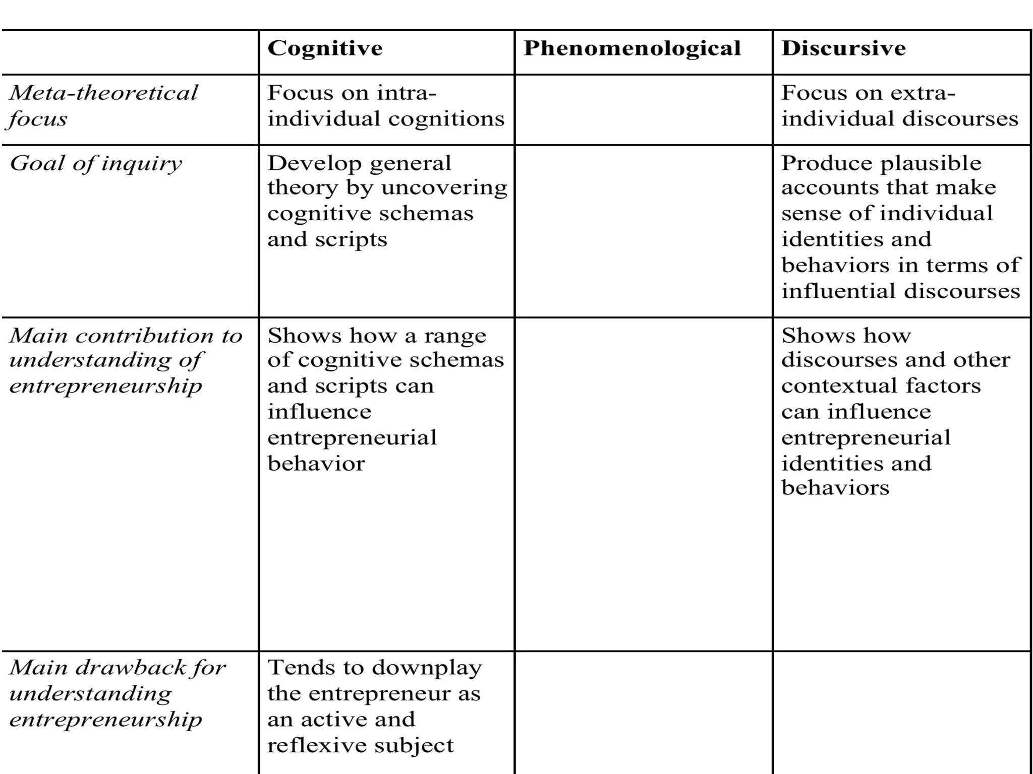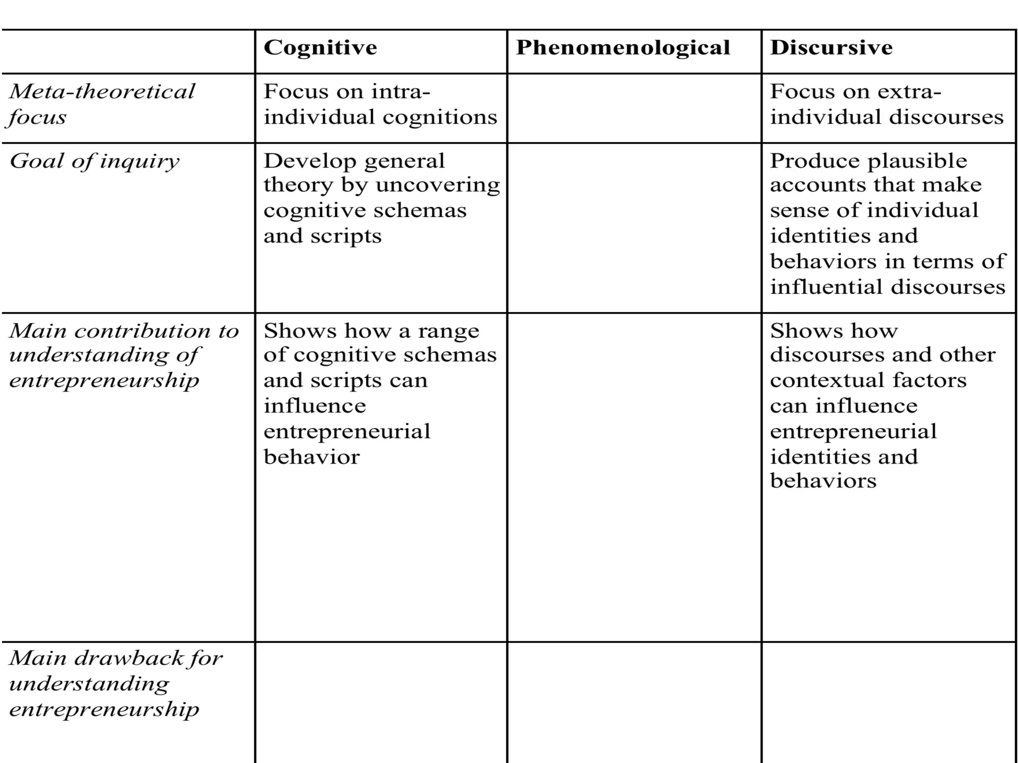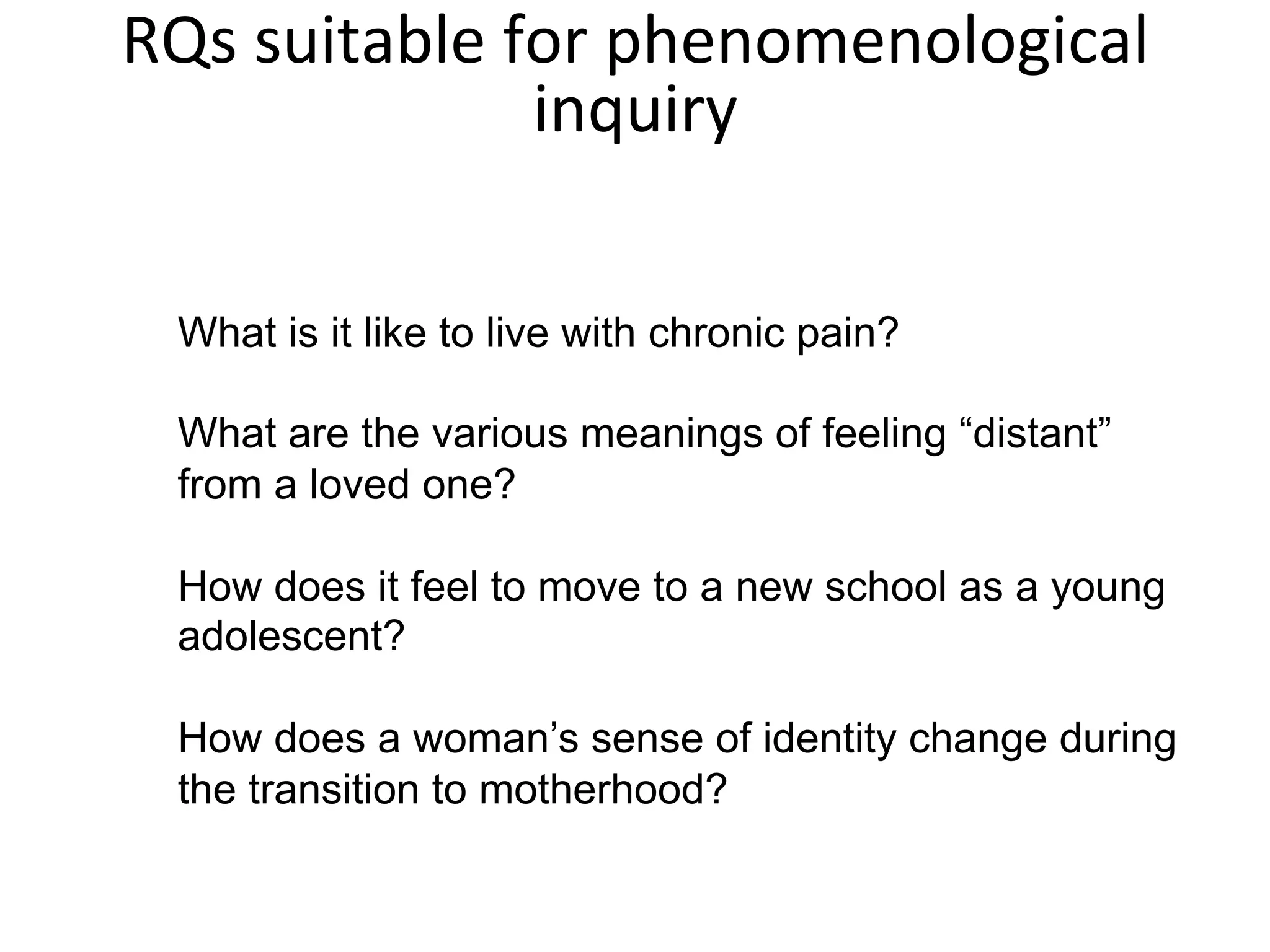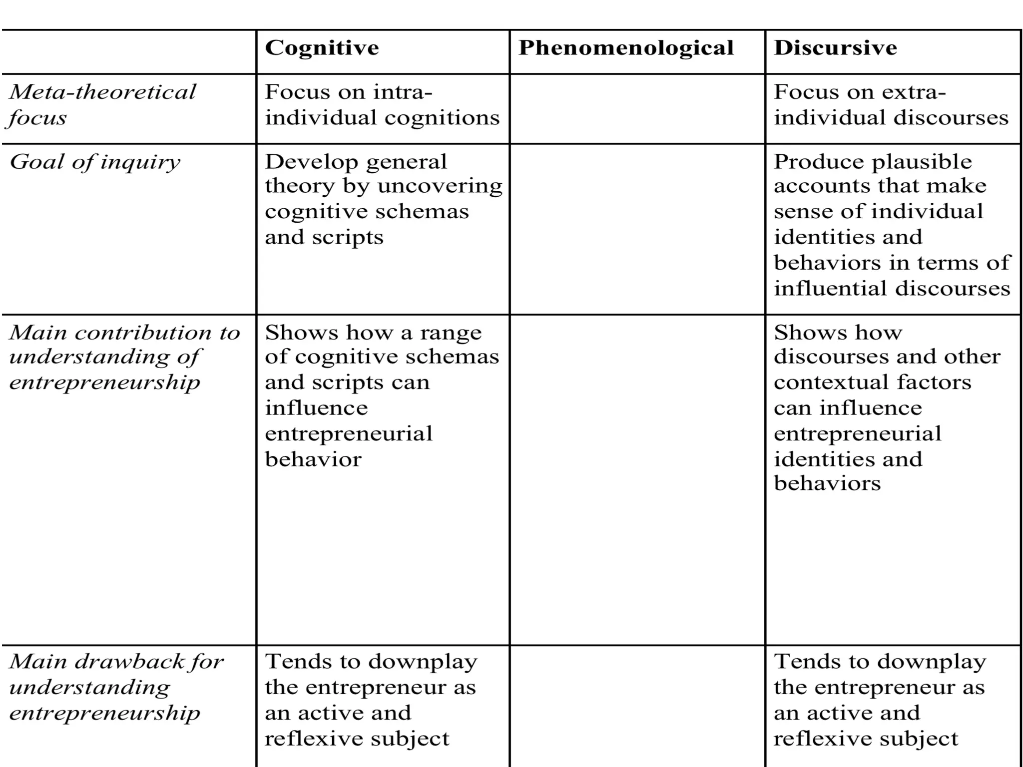 The document discusses phenomenology as a method for studying entrepreneurship. It begins by defining entrepreneurship as creating new products/services under conditions of uncertainty, rather than just small business ownership. It then discusses common approaches to studying entrepreneurs like traits, behaviors, cognitions and discursive factors, and argues phenomenology can provide insights these miss by focusing on entrepreneurs' lived experiences. The document provides an overview of phenomenology's principles and methods, including purposive sampling, semi-structured interviews to understand experiences, and analyzing data for themes. It provides examples of phenomenological entrepreneurship research questions and studies.