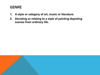 The document discusses genres of art and music, and describes the chosen genre of R&B music for a magazine. It notes that R&B magazines typically feature attractive artists dressed in styles like hats, blazers and jeans for males, and revealing clothes for females. The document also provides guidance on magazine design elements like the masthead, cover lines, selling lines, and using a dramatic main image of an attractive artist that matches the lead article.