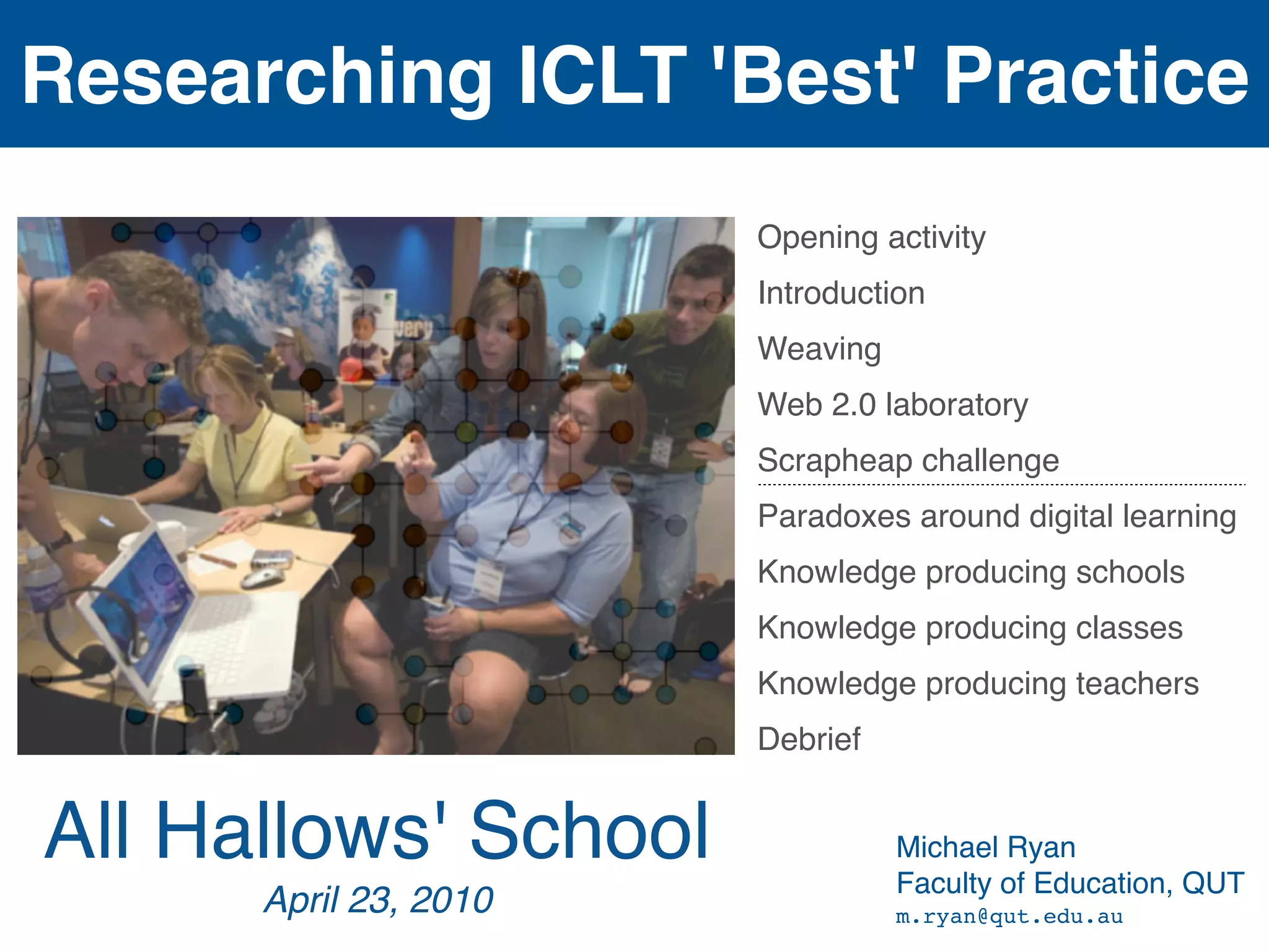 The document discusses the integration of Web 2.0 technologies in educational practices, emphasizing collaborative knowledge production and addressing myths surrounding digital learning. It presents various activities and experiments to explore the application of these technologies in classroom settings while highlighting the paradoxes involved in digital education. Additionally, it advocates for a shift in school roles towards fostering critical understanding and lifelong learning among students within a rapidly evolving digital landscape.