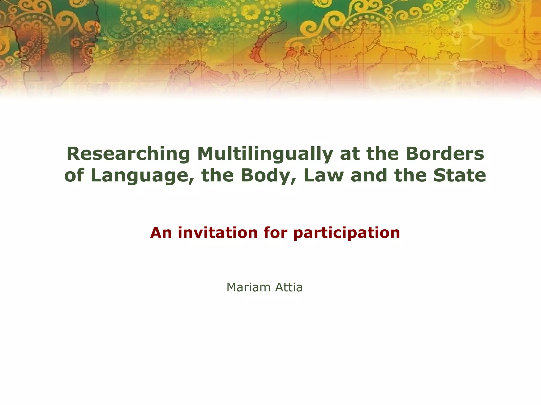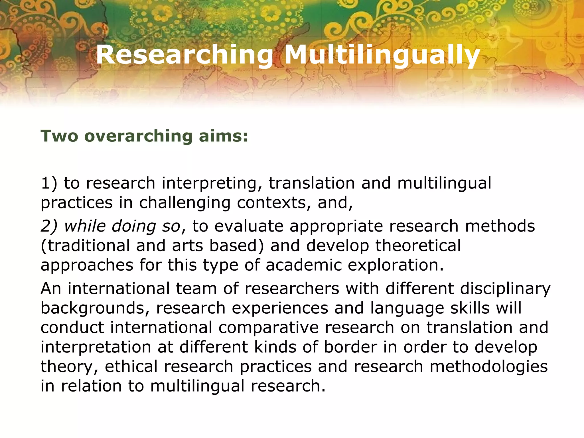 This document invites participation in a research project exploring multilingual practices at borders. The project has two overarching aims: 1) researching interpreting and translation in challenging contexts, and 2) evaluating appropriate research methods and developing theoretical approaches. An international team will conduct comparative case studies on translation/interpretation at different types of borders. The project includes two hubs utilizing complementary academic and creative research methods across five case studies examining topics like translating trauma, law, borders, and language education. Participants are invited to submit reflections on their experience with multilingual research to join an online researcher network.