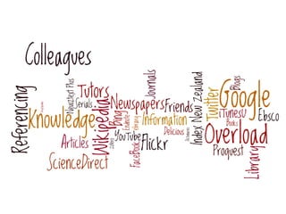 This document provides tips for researching online, including where to start searches, what types of information and search limits to consider, and how to manage information found online. It discusses using search engines like Google and Google Scholar effectively through search operators and advanced search. It also introduces library databases and recommends refining searches using subject headings, keywords in abstracts, and limiting searches by date, full text availability, and more. Tips are provided for managing search results and alerts as well as bookmarking, bibliographic management, and using social networks for research.