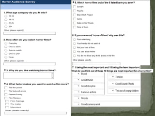 The document summarizes the results of surveys given to two age groups - 16-19 year olds and 25-35 year olds - about their preferences and consumption of horror films and trailers. Some key findings: