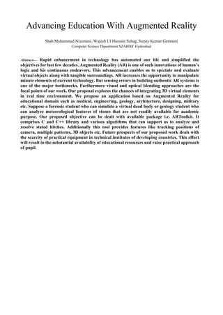 1) Augmented reality has the potential to advance education by allowing students to view virtual objects overlaid on the real world, making unavailable objects and scenarios accessible for learning.