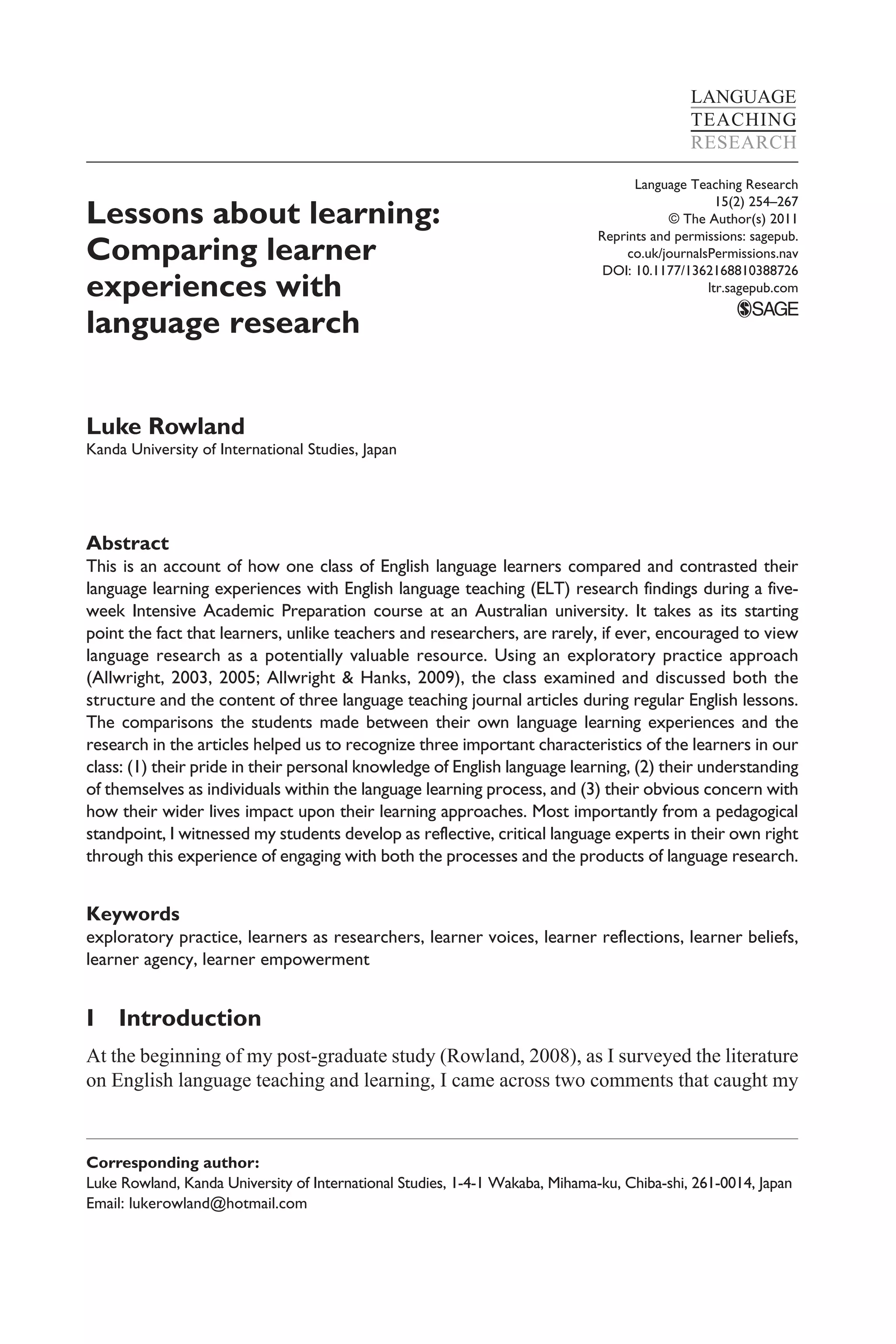 This document summarizes a study where the author engaged English language learners in examining and discussing language teaching research articles during their lessons. The students compared their own language learning experiences to the findings in the research articles. This helped the author learn about the students' pride in their language learning knowledge, understanding of themselves as individuals in the learning process, and concern for how outside factors impact their learning. Most importantly, it showed how the students developed as reflective, critical thinkers about language learning by directly engaging with both the processes and products of research.