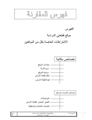 تتناول الوثيقة مقارنة بين موقعين لدراسة جدوى مشروع في حي الشرابية وأرض الجولف بمدينة نصر. تشمل الدراسة مقارنة في خصائص عقارية واجتماعية وبيئية، بالإضافة إلى الخدمات والمرافق المتاحة في كلا الموقعين. تشير النتائج إلى تفضيل موقع أرض الجولف للسكن بسبب الهدوء والخدمات الاجتماعية الأفضل.