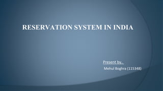 The document outlines India's reservation system, which is aimed at providing affirmative action for scheduled castes (SC), scheduled tribes (ST), and other backward classes (OBC) in employment and education. It details the historical context of reservations before and after independence, along with legal frameworks and specific percentages reserved for various groups. The advantages and disadvantages of the reservation system are discussed, highlighting its impact on representation and meritocracy.