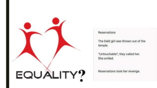The document discusses the reservation system in India, outlining its history, current status, and various types including education, gender, caste, and employment-based reservations. It highlights both the advantages and disadvantages of the system, noting its role in social justice and representation, while also addressing concerns about meritocracy and economic inequality. The conclusion suggests that while reservations were initially necessary, their continued relevance should be carefully reconsidered, with a focus on ensuring that benefits reach those who genuinely need them.