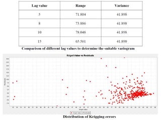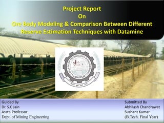 This project report compares different mineral reserve estimation techniques using Datamine software. The objectives are to reduce costs and time for reserve estimation, predict suitable techniques for precise and accurate reserve computation, and facilitate economic mining. The report describes nearest neighbor, inverse distance, and ordinary kriging methods. It then details the methodology used to model an ore body in Datamine and compare error rates between ordinary kriging and other techniques. The conclusion is that nearest neighbor overestimates grade and underestimates volume while inverse distance overestimates both compared to ordinary kriging.
