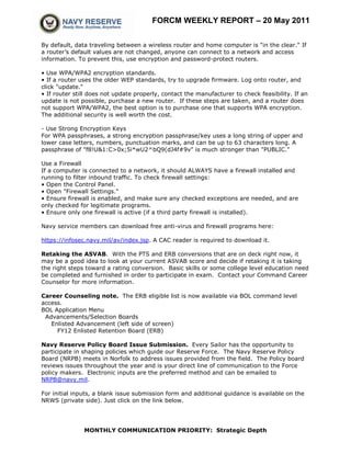 The weekly report provides updates on Navy programs and policies. It recognizes the 2010 Sailors of the Year who were advanced to chief petty officer. It emphasizes the importance of verifying that reviews like CDBs and PRIMs reports are completed accurately. The report also provides information on securing personal data when working from home and notes opportunities for sailors to provide input through the Navy Reserve Policy Board.