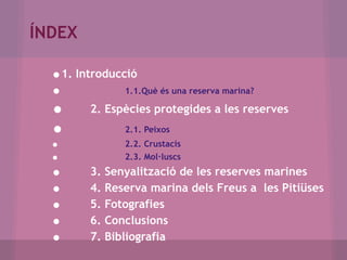 ÍNDEX 1. Introducció1.1.Què és una reserva marina? 2. Espècies protegides a les reserves 2.1. Peixos 2.2. Crustacis 2.3. Mol·luscs 3. Senyalització de les reserves marines 4. Reserva marina dels Freus a les Pitiüses 5. Fotografies 6. Conclusions 7. Bibliografia
