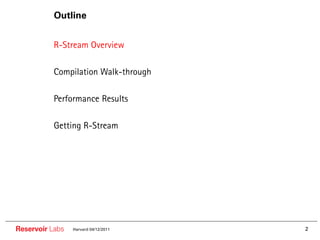 The document describes the R-Stream high-level program transformation tool. It provides an overview of R-Stream, walks through the compilation process, and discusses performance results. R-Stream uses the polyhedral model to perform program transformations like loop transformations, fusion, distribution and tiling to optimize for parallelism and locality. It models the target machine and uses this to inform the mapping of operations to resources like GPUs.