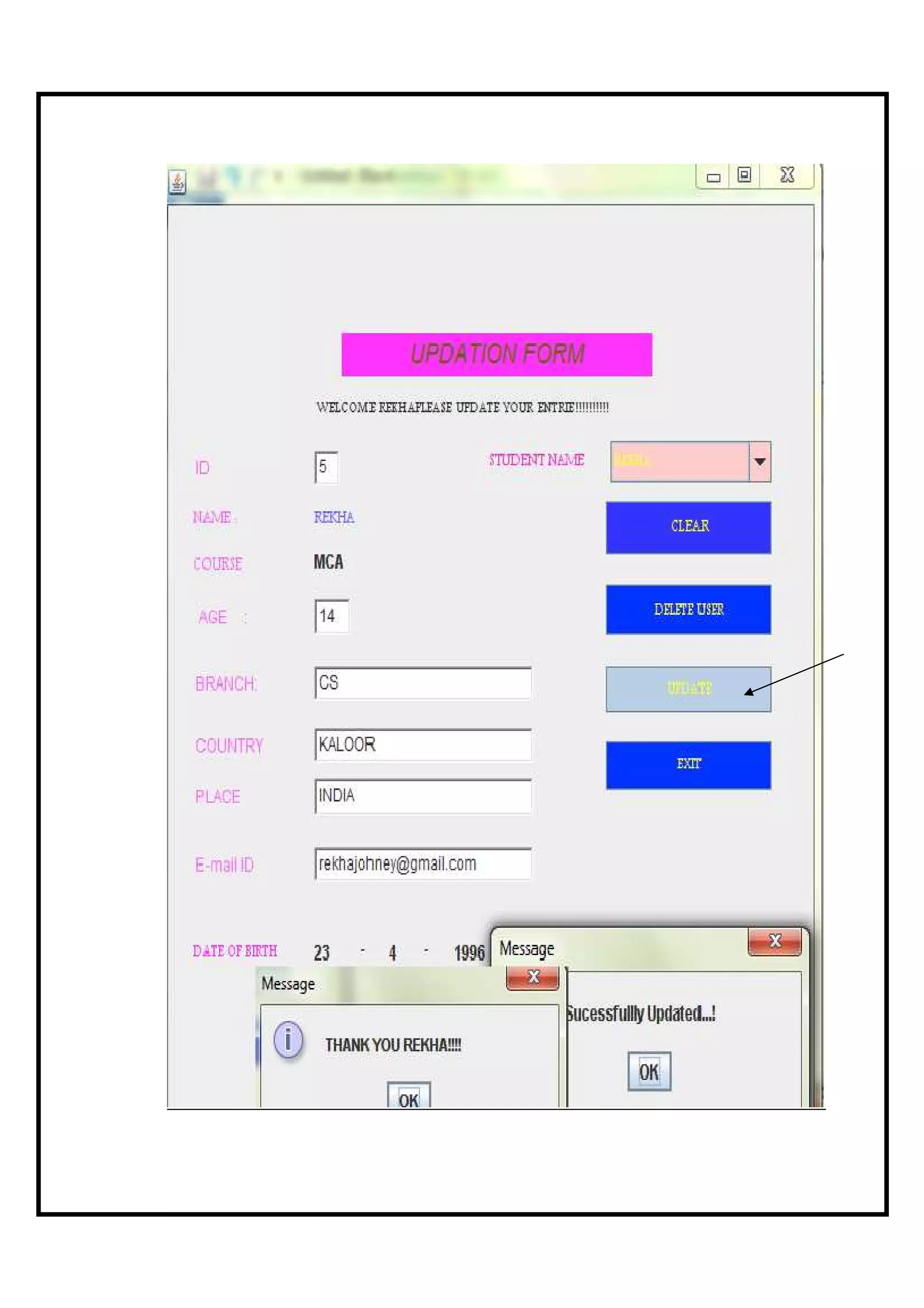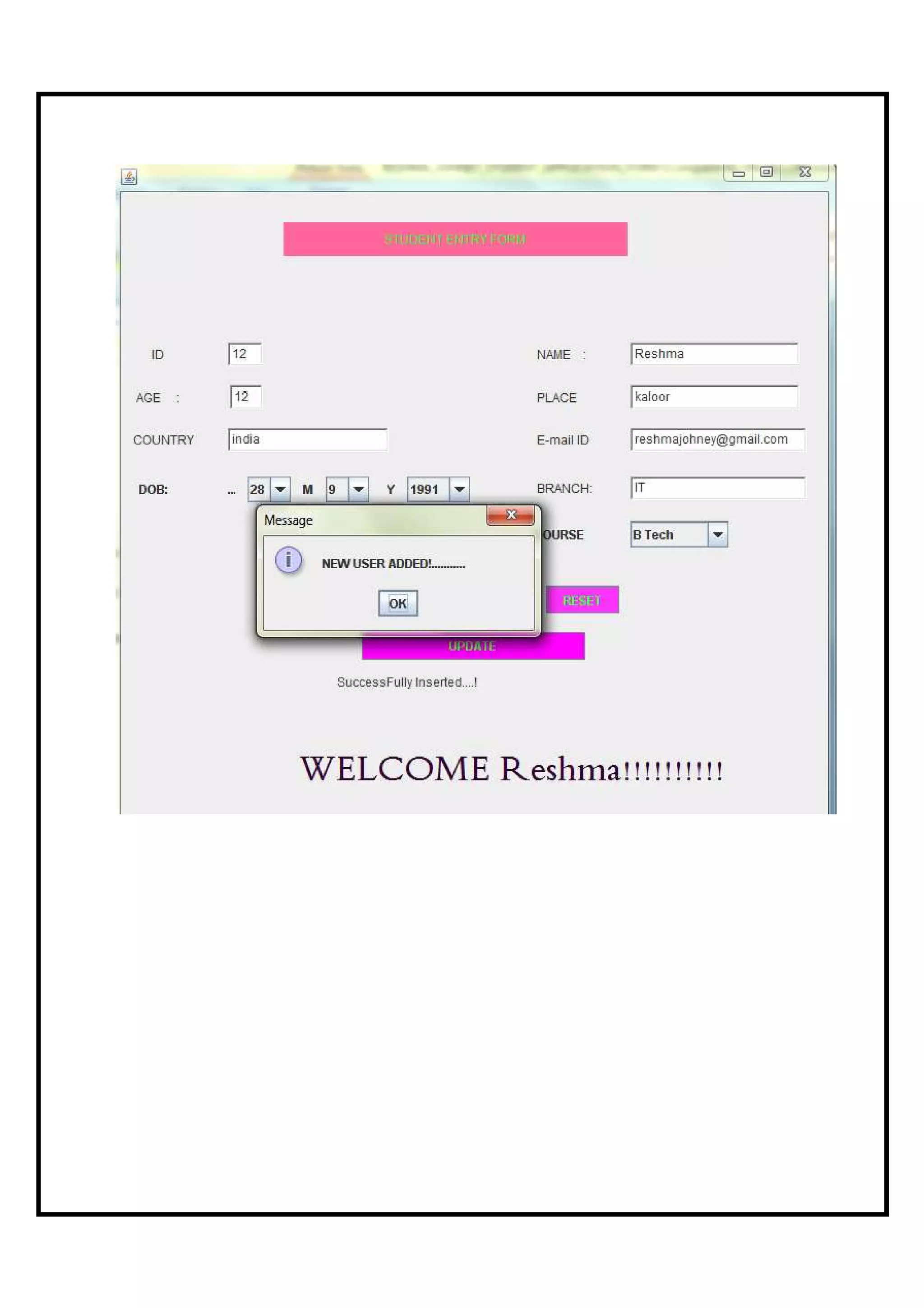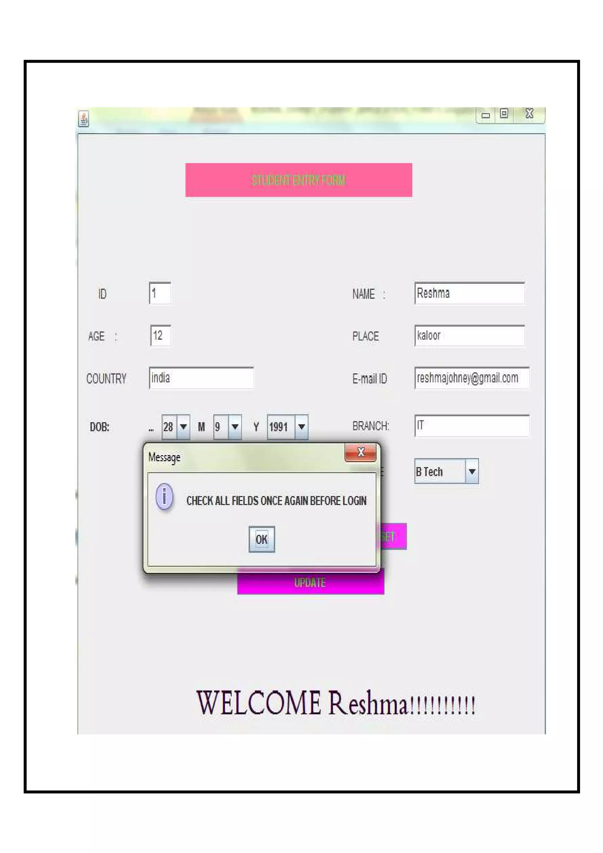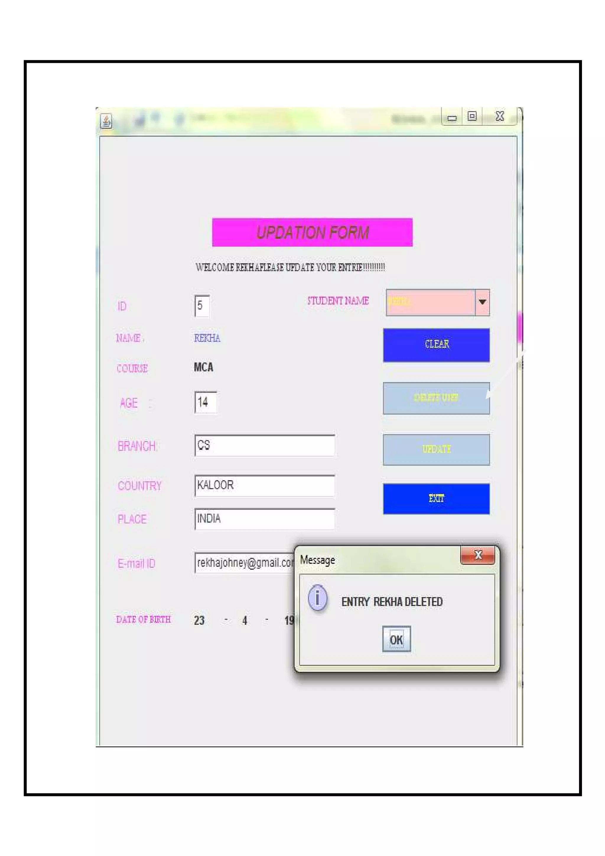This document describes a student application form project that was developed to allow easy entry, updating and deletion of student details from a database. The project uses Java Swing controls and stores data in a Microsoft Access database. Key aspects of the project include forms for submitting new student applications, updating existing student details, and deleting student records from the database. The document outlines the theoretical background of the technologies used, describes the database and form designs, and provides the program code to implement the student application functionality.