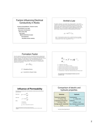 The document discusses electrical resistivity methods for measuring the resistivity of rocks. It defines key concepts like resistance, resistivity, and conductivity. Rock resistivity is influenced by factors like metallic sulfide content, porosity, clay content, pore saturation, and water salinity. Various electrode arrays like Wenner and Schlumberger are used to measure resistivity in the subsurface. Resistivity can provide information about rock properties and subsurface structures and fluids.