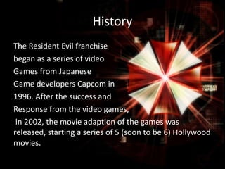 The Resident Evil franchise began as a popular video game series in 1996 and was adapted into a film series starting in 2002. The first Resident Evil movie was directed by Paul W.S. Anderson and starred Milla Jovovich and Eric Mabius. It was produced and distributed by several film companies and was marketed towards the existing fan base of the video game series. While the movie was financially successful, it received mixed reviews from critics who felt it lacked substance beyond style.