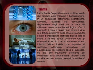 Resident Evil è un film del 2002, diretto da Paul W. S. Anderson, ispirato alla serie di videogiochi survival horror di Capcom. La trama ruota attorno a un virus che trasforma le persone in zombie all'interno di un laboratorio sotterraneo della Umbrella Corporation, con una squadra di soccorso che deve affrontare creature mostruose per sopravvivere. Il film ha generato diversi sequel e una serie di adattamenti, mantenendo fede a elementi della trama originale del videogioco.