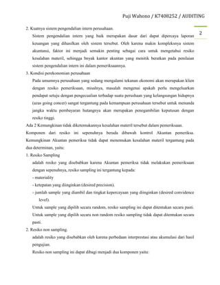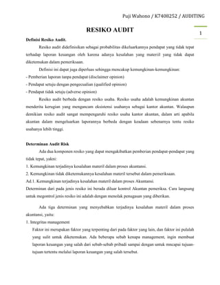 Dokumen tersebut menjelaskan tentang definisi dan determinan resiko audit serta cara mengendalikannya. Resiko audit adalah kemungkinan pendapat auditor salah terhadap laporan keuangan karena kesalahan material yang tidak terdeteksi. Determinannya adalah kemungkinan terjadinya kesalahan akuntansi dan kemungkinan tidak terdeteksi dalam audit. Untuk mengendalikan resiko, auditor perlu mempertimbangkan faktor-faktor yang dapat mempengaruhi res
