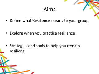The document defines psychological resilience as the ability to adapt to stress and adversity, highlighting various situations where resilience is needed, such as college, employment, and health issues. It suggests coping strategies like learning from situations, maintaining a positive attitude, planning, exercising, and seeking help. Additionally, it references a motivational video by Nick Vujicic to further illustrate resilience.