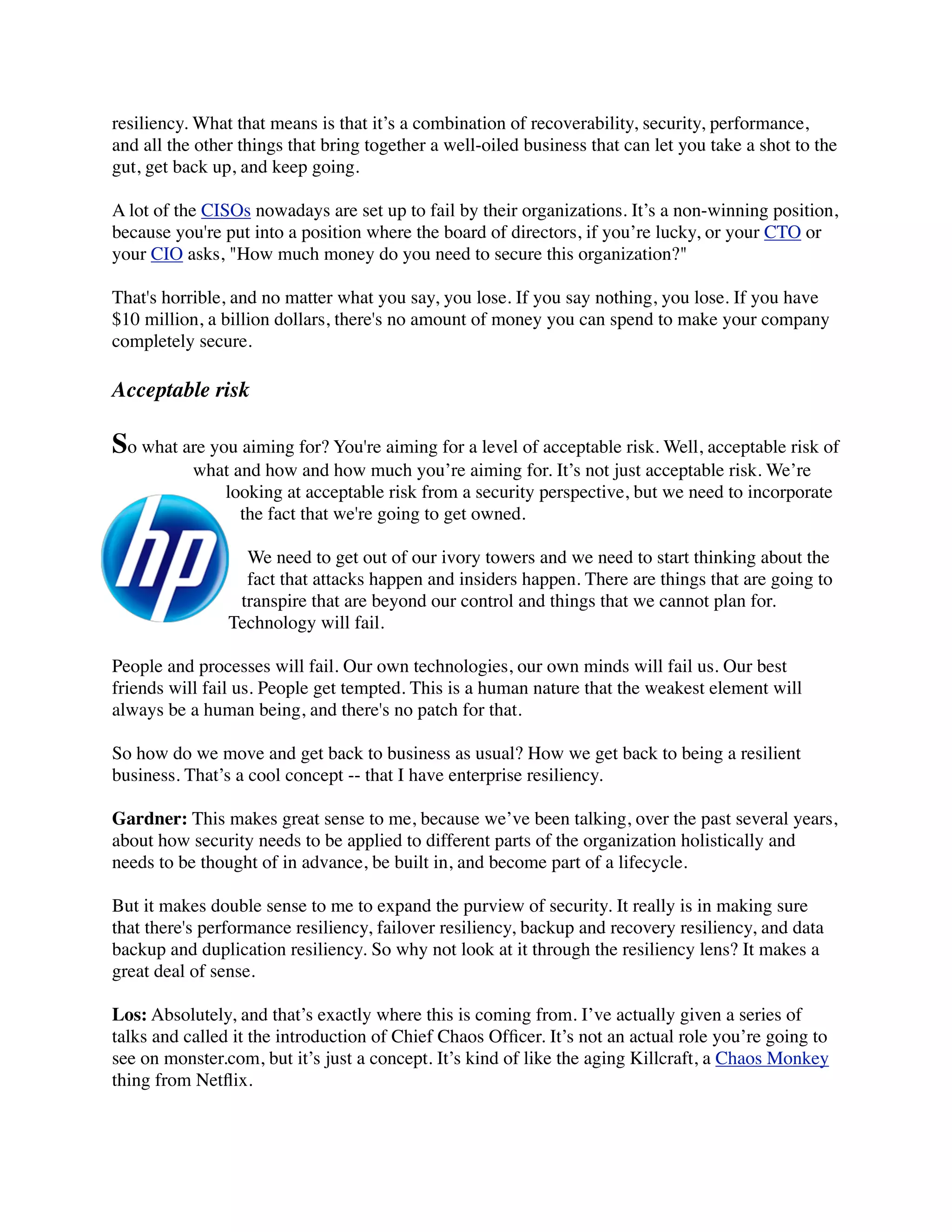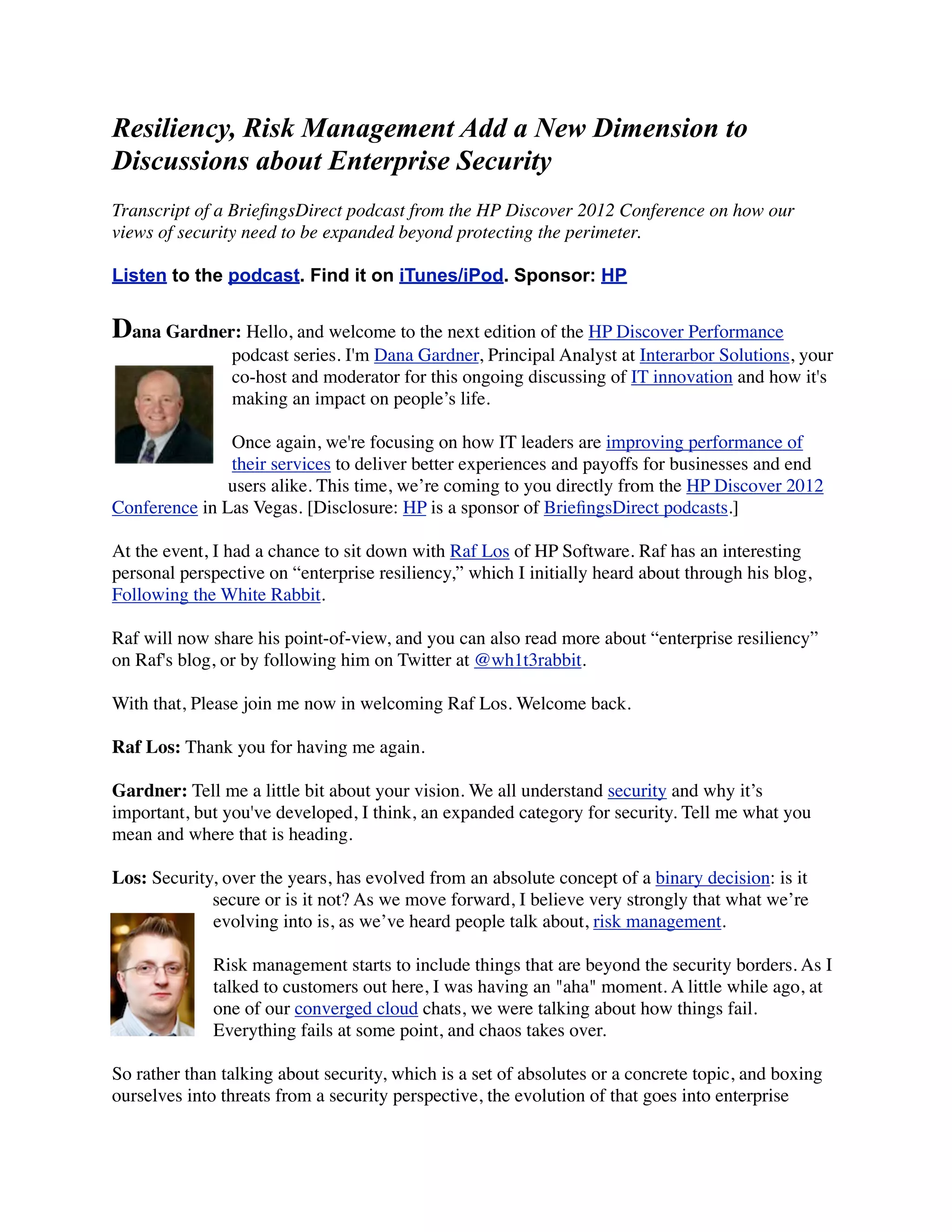 The document discusses the evolving perspective of enterprise security, shifting from a focus solely on perimeter protection to the broader concept of enterprise resiliency, which incorporates risk management, recoverability, and organizational performance. Raf Los of HP Software emphasizes the need to accept that failures will occur and to architect systems for resilience and flexibility, particularly in the context of cloud solutions that can enhance small-to-medium businesses' security. The podcast underscores the importance of innovative disaster recovery technologies and the advantages of using a converged cloud approach to improve overall organizational resiliency.