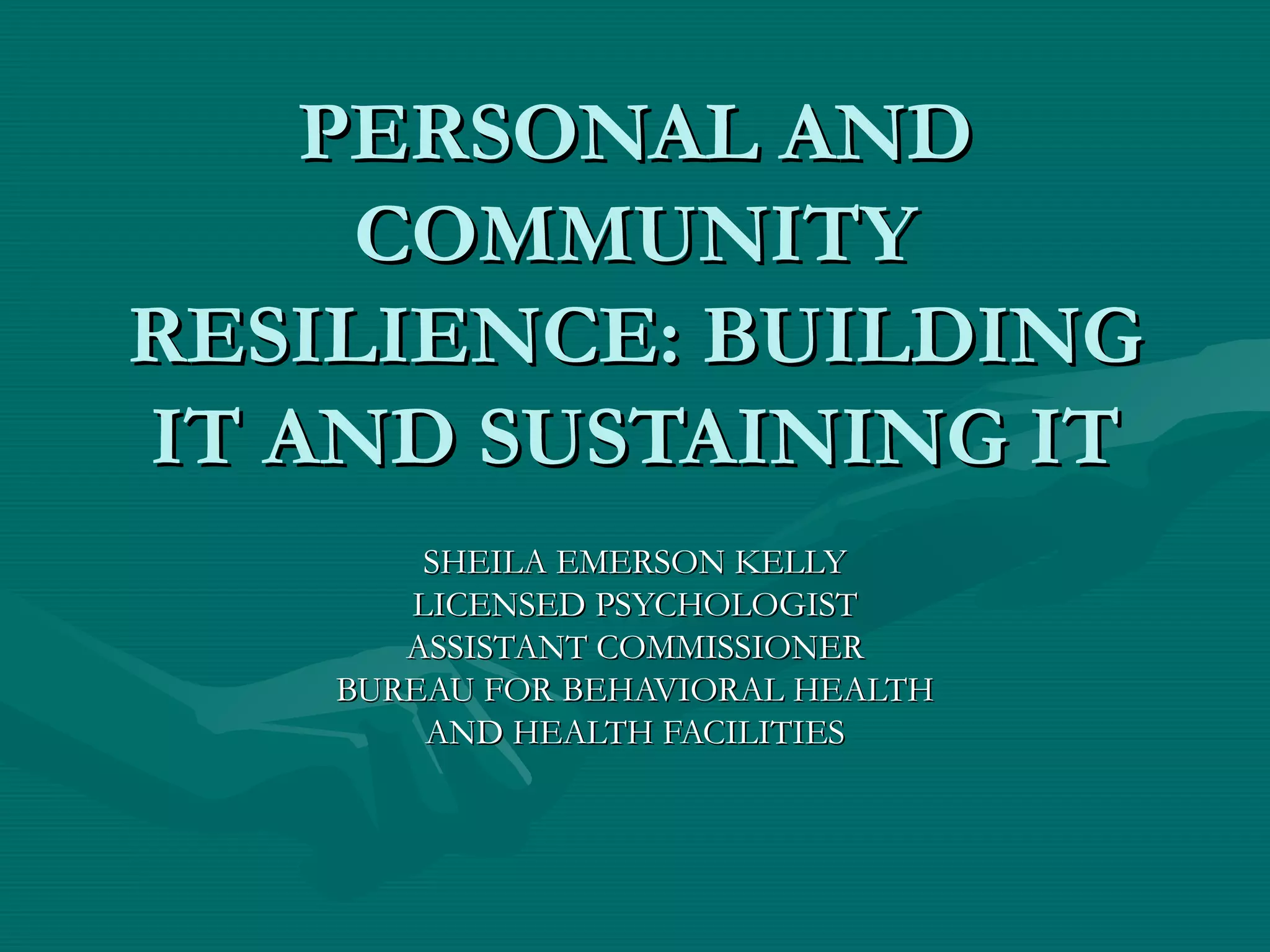 Resilience refers to the ability to adapt well in difficult situations and bounce back from adversity. For communities to be resilient, members must take early actions before disasters to reestablish stability after events. Personal and community resilience are developed through social connections, access to resources, coping strategies, and participation in community groups. Building resilience requires nurturing relationships, sharing responsibilities, and open communication between community members and leaders.
