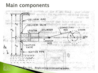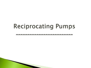 Reciprocating pumps are positive displacement pumps suitable for high heads and low flows. They deliver a pulsed flow that can be smoothed out with accumulators. A reciprocating pump consists of a piston inside a cylinder that moves back and forth, driven by a crankshaft, to draw fluid in through a suction valve and push it out a discharge valve. They are more suitable than centrifugal pumps for high heads, small discharges, and viscous liquids, but require more maintenance due to moving parts. Common applications include oil and gas production, pipelines, refineries, and chemical processing where high pressures are needed.