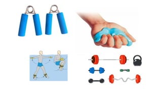 Resisted exercise involves opposing mechanical or manual resistance to muscle action in order to strengthen muscles. As muscles contract against increasing resistance, they hypertrophy and gain power and endurance. Progressive resisted exercise (PRE) systematically increases weight over time to continually challenge muscles. PRE techniques like DeLorme-Watkins use repetitions with increasing percentages of 10 repetition maximum weight to improve strength, while Oxford technique decreases weight in small increments each set to enhance endurance. Resisted exercise strengthens muscles and increases blood flow, with benefits including restored muscle power and maintenance of strength.