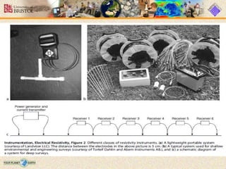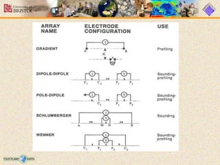 This presentation discusses electrical resistivity methods for geophysical surveying. It describes how resistivity utilizes differences in electric potential to image the subsurface. Key concepts covered include Ohm's law, electrode configurations like Wenner and Schlumberger arrays, methods like vertical electrical sounding and electric profiling, and instrumentation used including current sources, resistivity meters, and electrode types. Applications mentioned are groundwater detection, mineral exploration, and waste exploration.