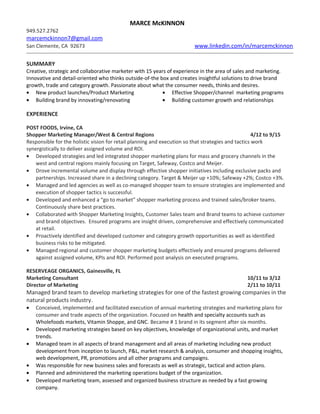 Marce McKinnon is a creative and strategic marketer with 15 years of experience in sales and marketing. She has experience managing shopper marketing programs, developing brand strategies, and launching new products. Her background includes roles at Post Foods, Reserveage Organics, Hero Nutritionals, Nestle Purina, and Nestle USA focused on growing brands, driving sales, and innovating in the consumer packaged goods industry.