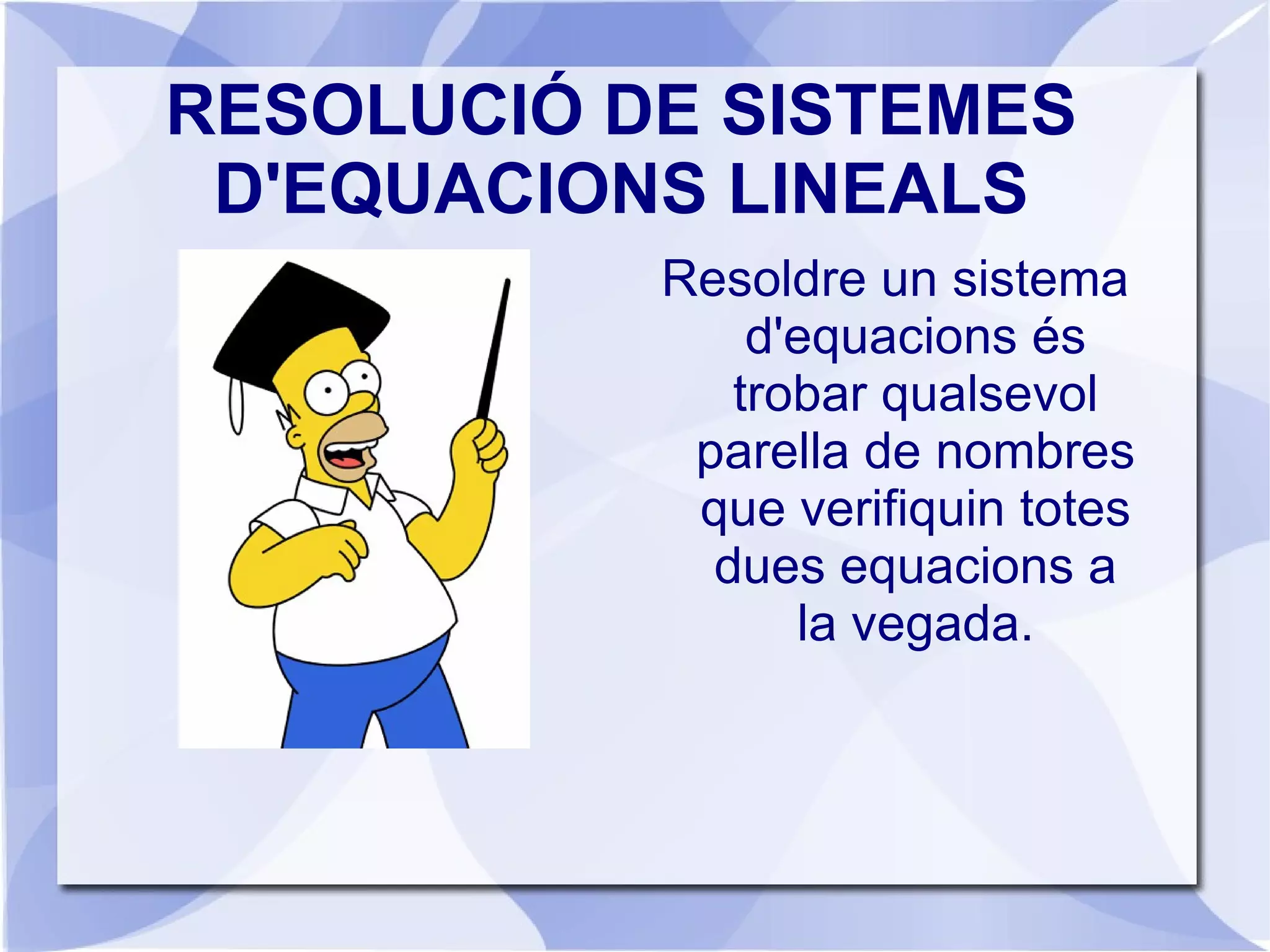RESOLUCIÓ DE SISTEMESD'EQUACIONS LINEALS Resoldre un sistema d'equacions és trobar qualsevol parella de nombres que verifiquin totes dues equacions a la vegada.