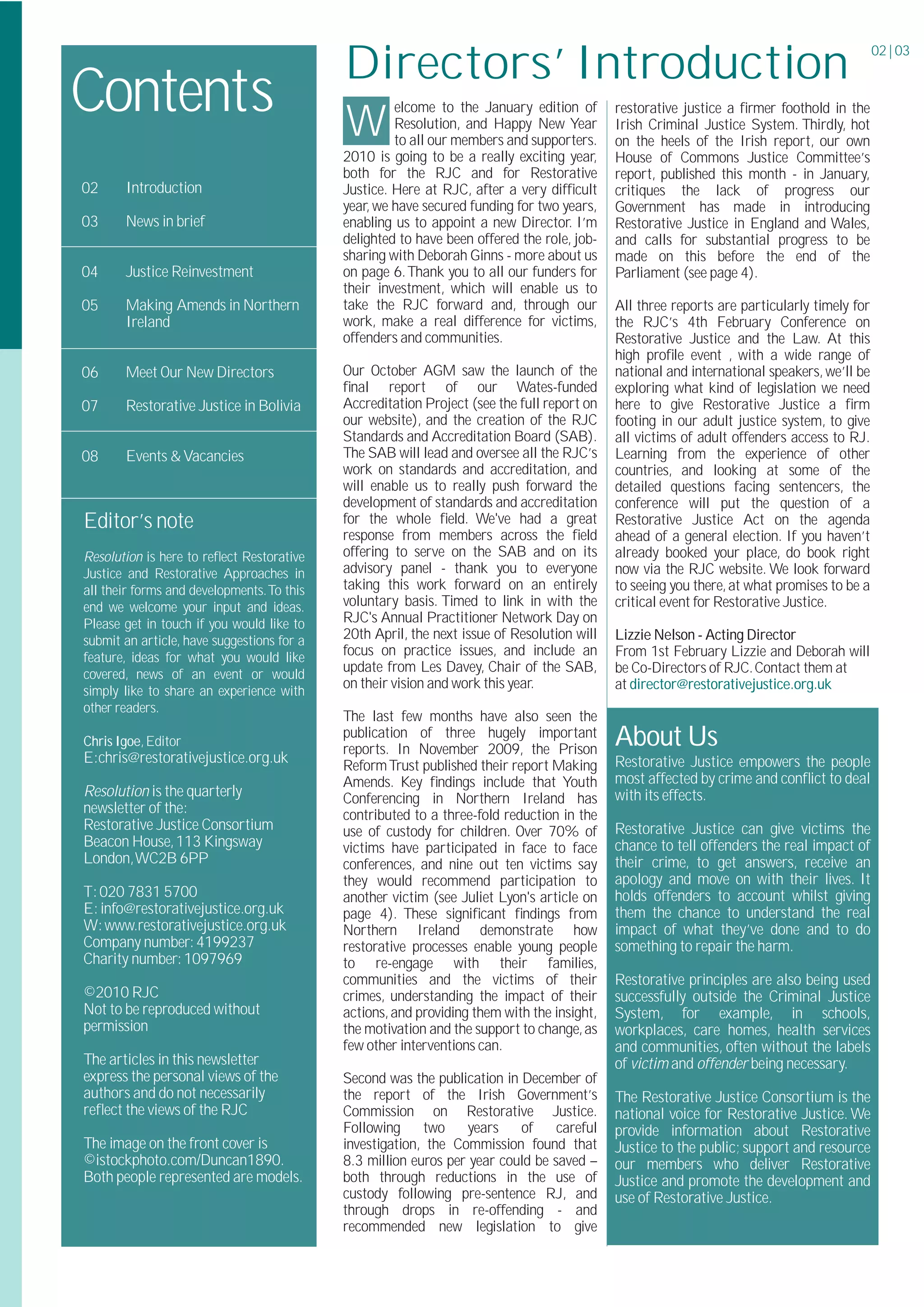 The document presents the January 2010 edition of Resolution from the Restorative Justice Consortium, highlighting significant updates and initiatives in restorative justice in Northern Ireland, England, and Wales. It reports on new legislative recommendations and the impact of various restorative justice practices, showcasing successful programs that reduce re-offending and support victims. Key findings include greater victim satisfaction and cost savings associated with restorative justice processes, alongside ongoing efforts to secure a statutory footing for these practices in the justice system.